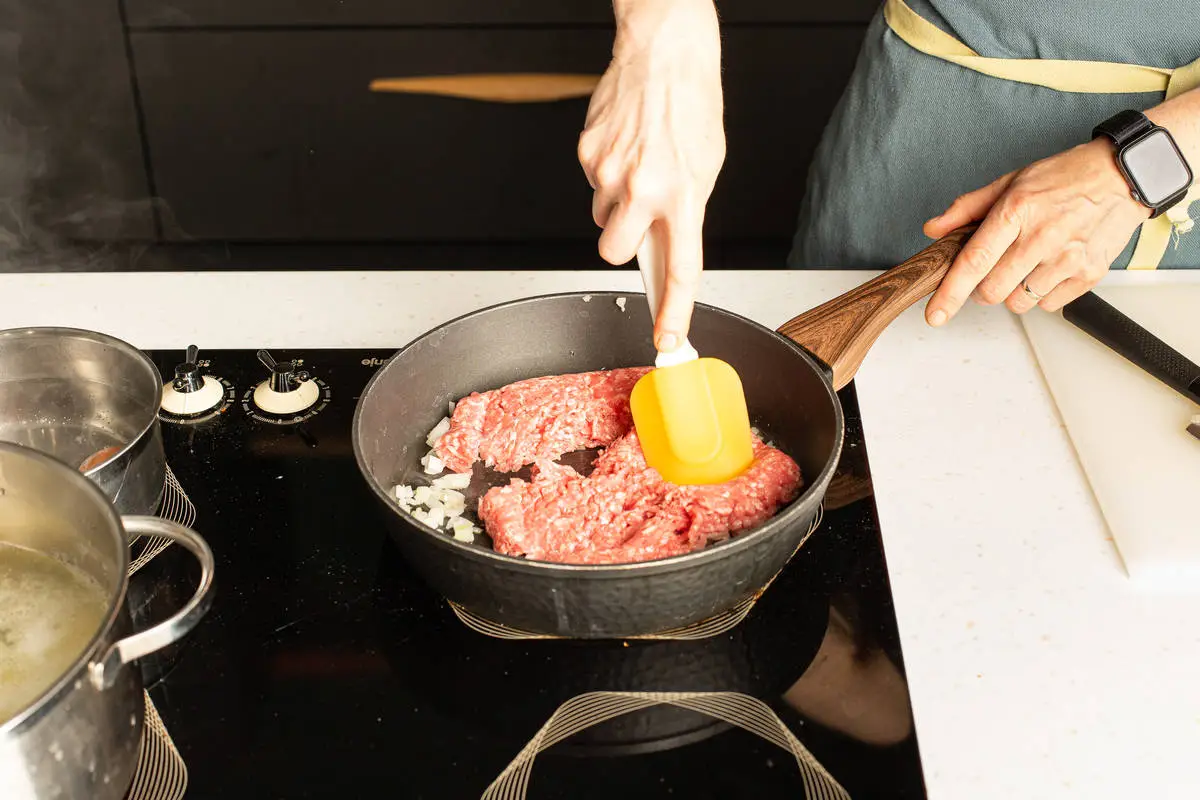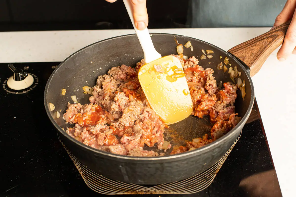 Добавьте фарш и обжаривайте, помешивая, ещё 5 минут.