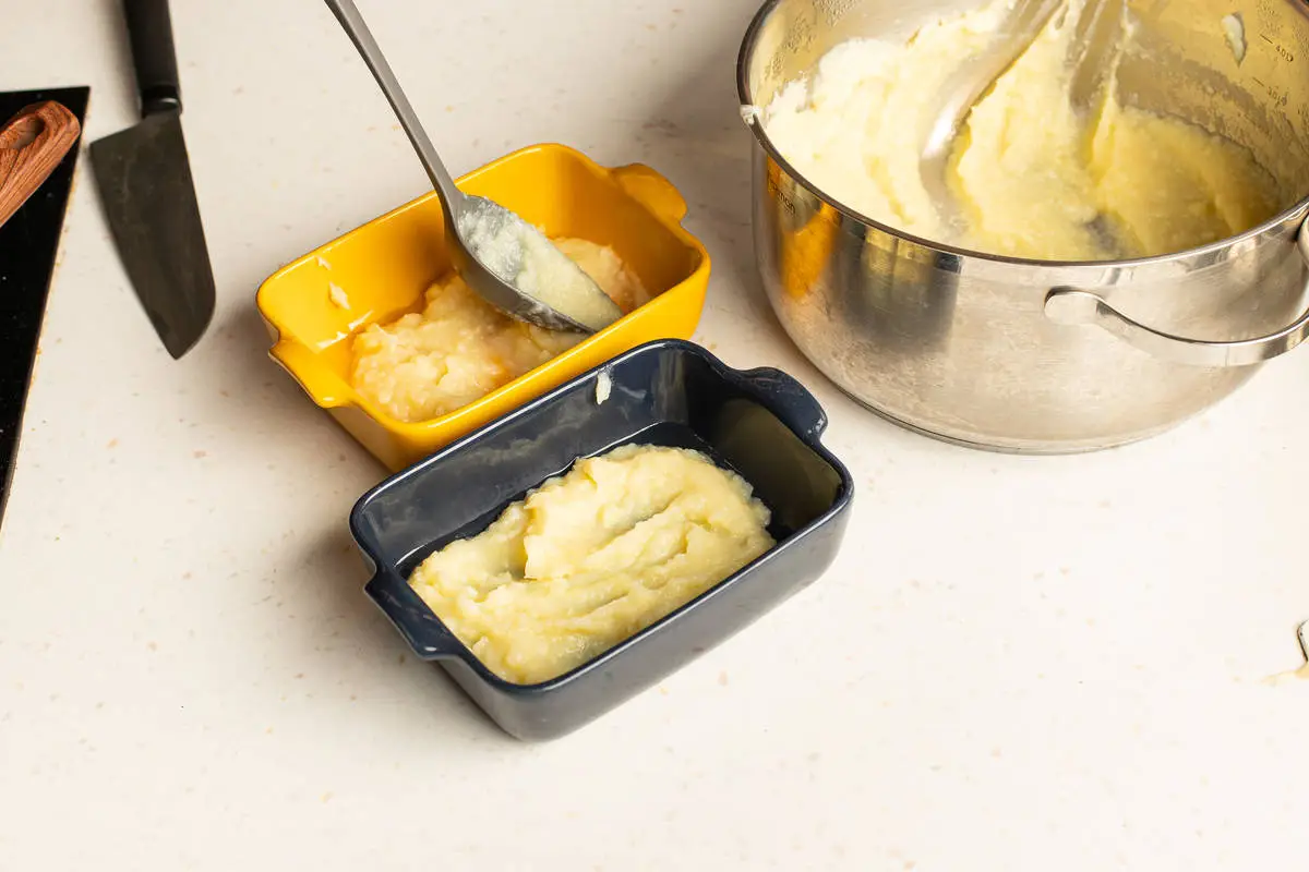 В форму для запекания положите 2-3 ст. ложки пюре и размажьте по дну.