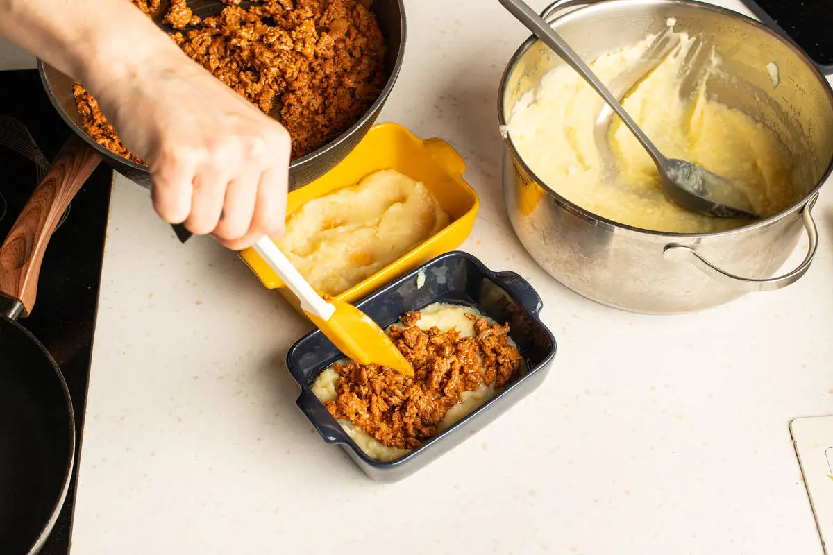 Затем выложите фарш, распределите по форме, сверху выложите оставшееся пюре.
