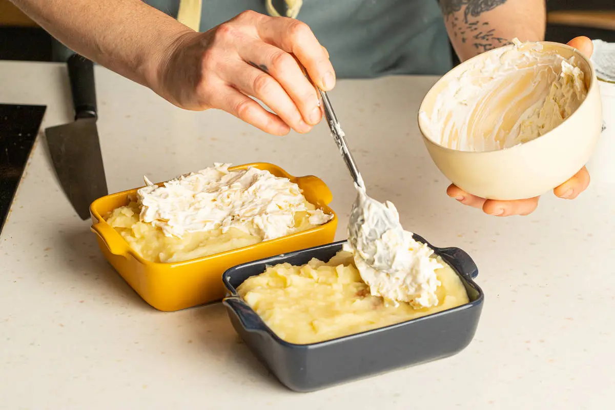 Сметану перемешайте с тёртым сыром, выложите поверх пюре и разровняйте.