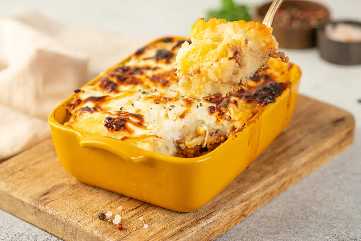 Классическая домашняя запеканка с фаршем и картофельным пюре. Обязательно добавьте щепотку корицы в фарш — вы удивитесь, насколько удачно она дополняет вкус блюда.