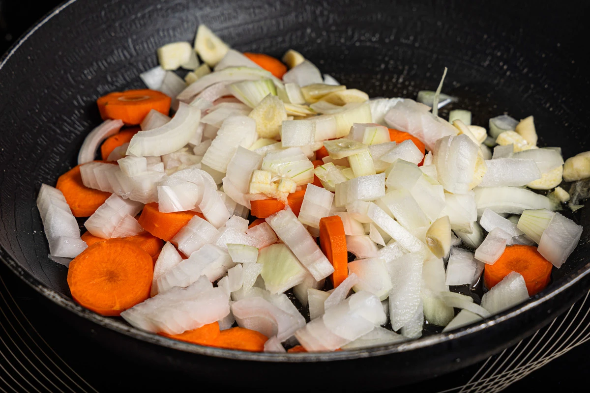 Разогрейте сковороду с растительным маслом. Выложите морковь, лук, чеснок, посолите, поперчите по вкусу.