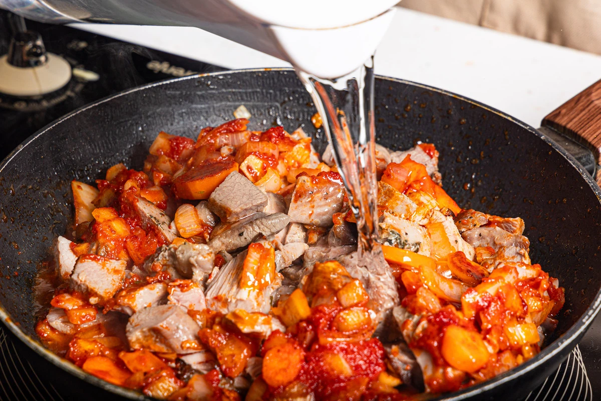 Шашлык нарежьте кусочками. Положите в сковороду с овощами, налейте немного воды. Тушите всё вместе примерно 20 минут.