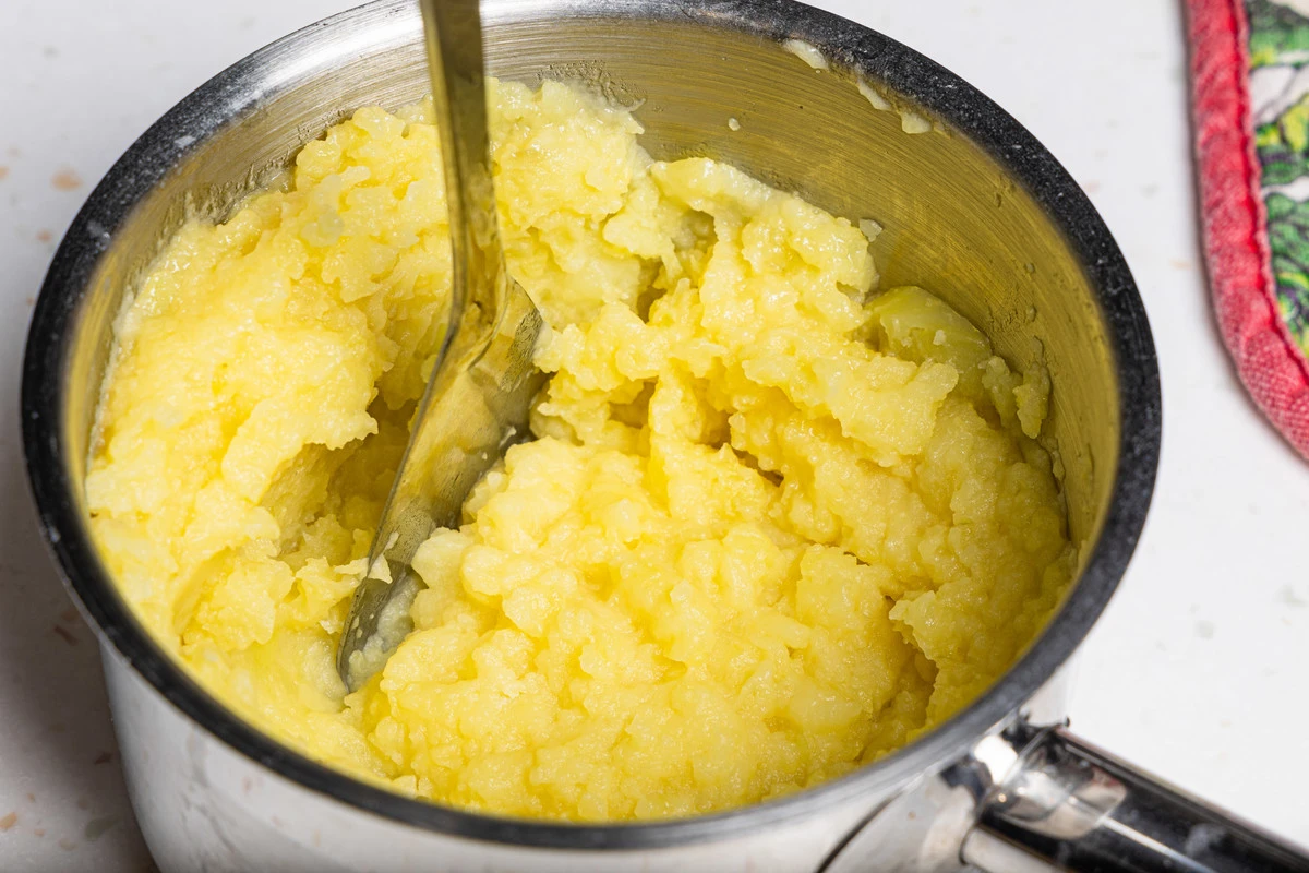 Картошку помните в пюре. Добавьте сливочное масло, перемешайте.