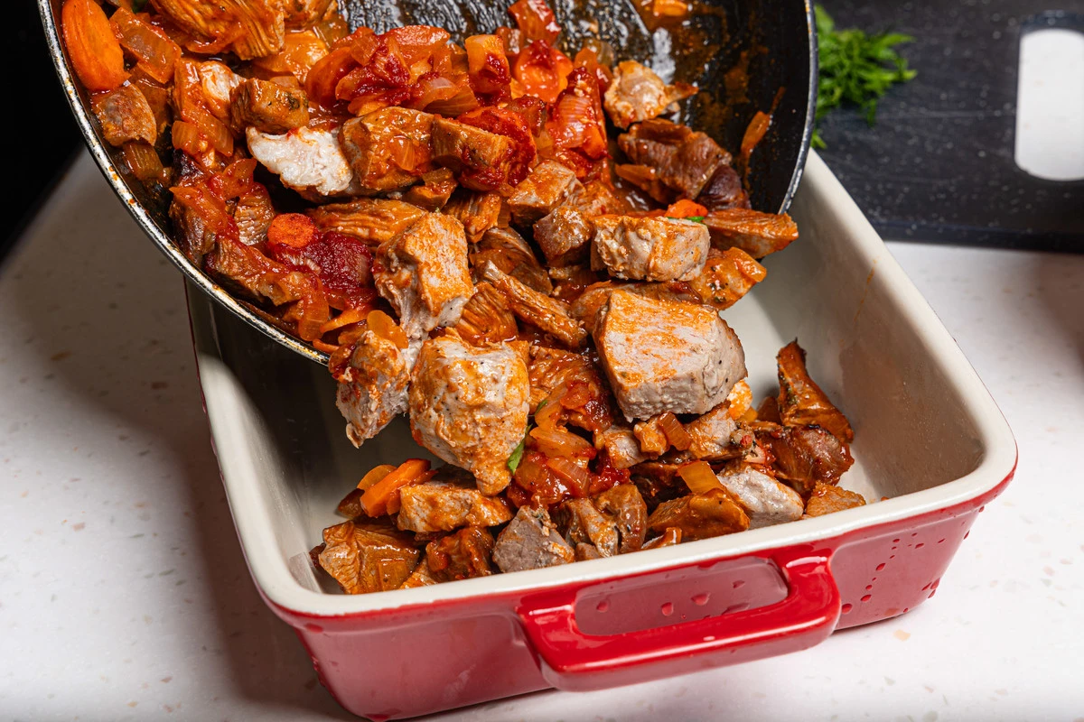 Выложите в форму тушёное мясо с овощами.