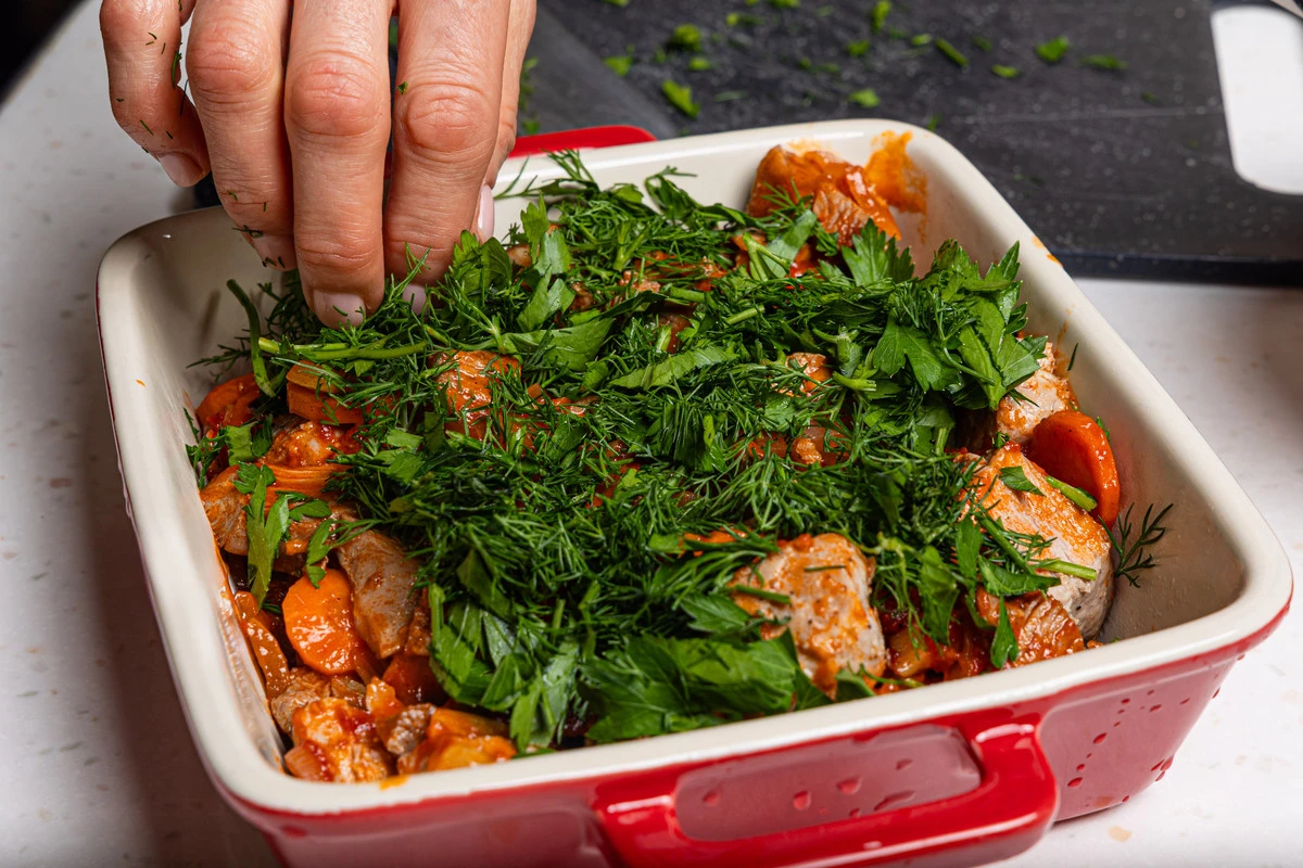 На зелень — картошку, разровняйте лопаткой. Запекайте в разогретой до 180 ℃ духовке примерно 30 минут. Подавайте, посыпав свежей зеленью.