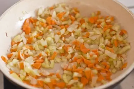 Нарежьте кубиками лук, измельчите чеснок и обжарьте всё в растительном масле в течении минуты на среднем огне.