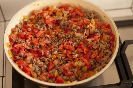 Когда фарш будет хорошо прожарен, добавьте очищенные от кожицы помидоры и влейте бульон. Если бульона нет, замените его водой. Добавьте лавровый лист и потушите блюдо под крышкой на небольшом огне до выпаривания жидкости. В конце добавьте порубленную петрушку.