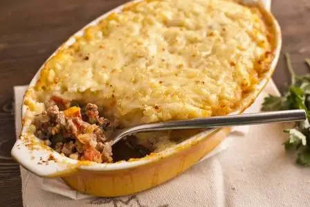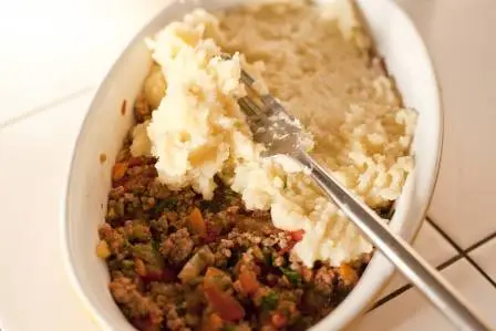 Жаропрочную форму смажьте сливочным маслом. Выложите в неё сначала фарш, предварительно достав из него лавровый лист, а затем картофельное пюре. Разровняйте блюдо и поставьте его в разогретую до 180 градусов духовку.