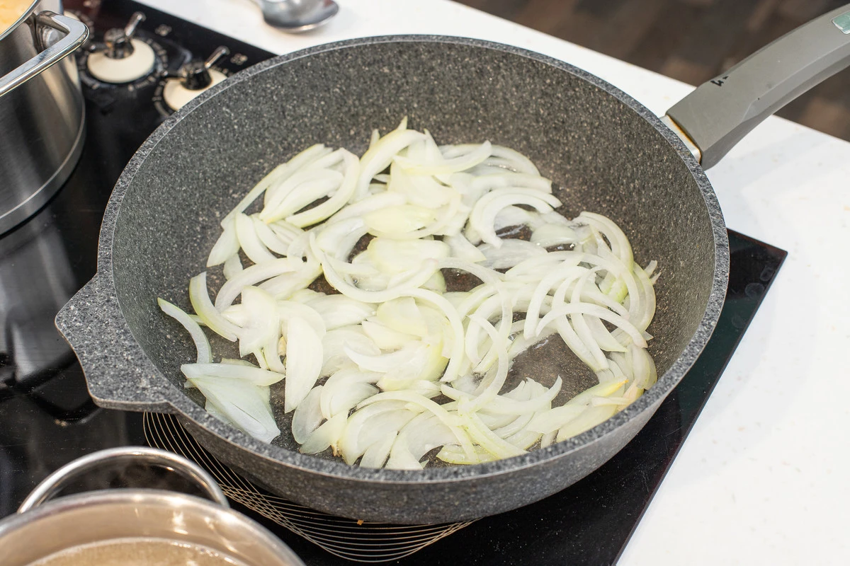 Лук почистите и нарежьте полукольцами. Разогрейте сковороду с 1-2 ст. л. растительного масла и обжарьте лук до золотистого цвета в течение 5-7 минут, периодически помешивая.