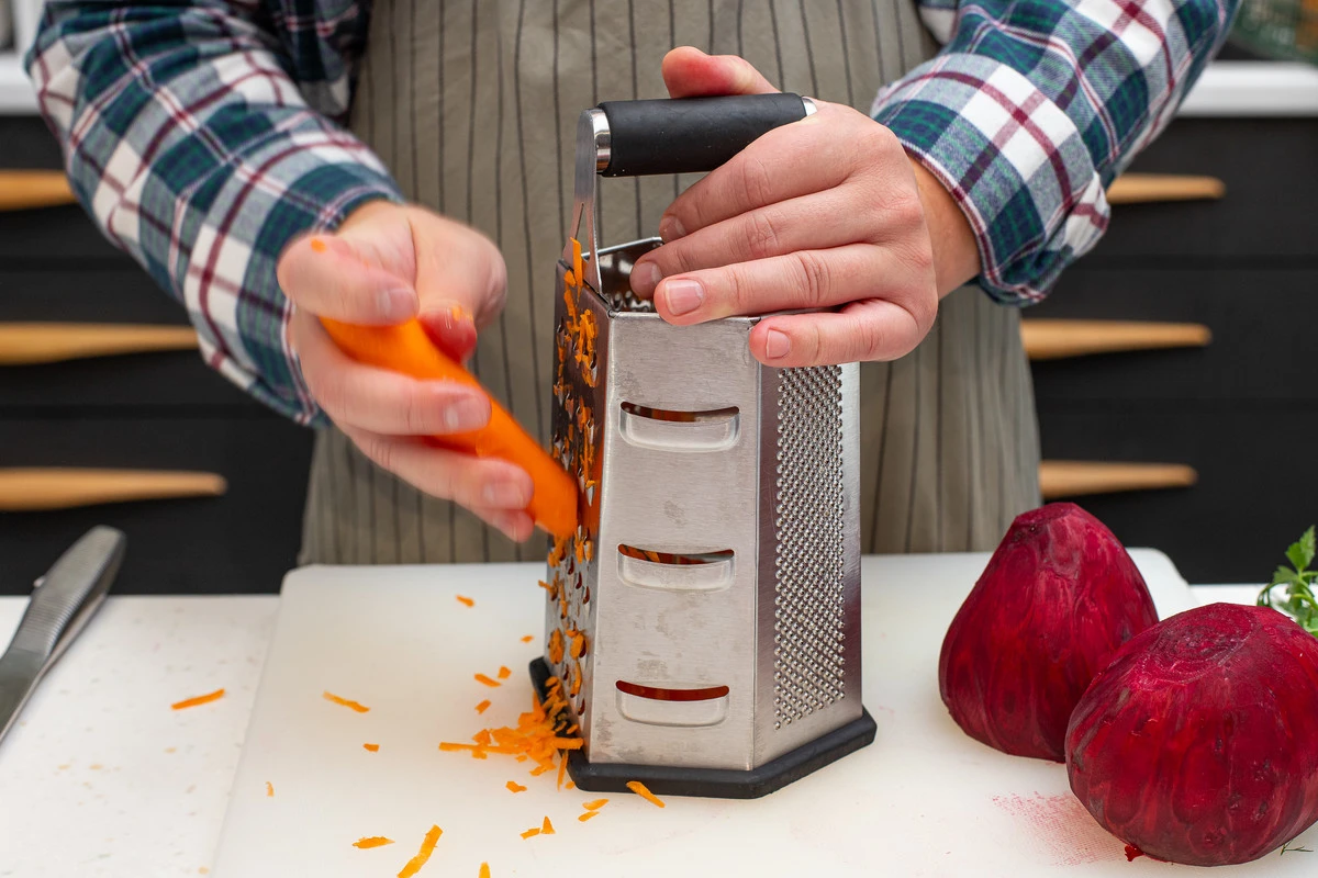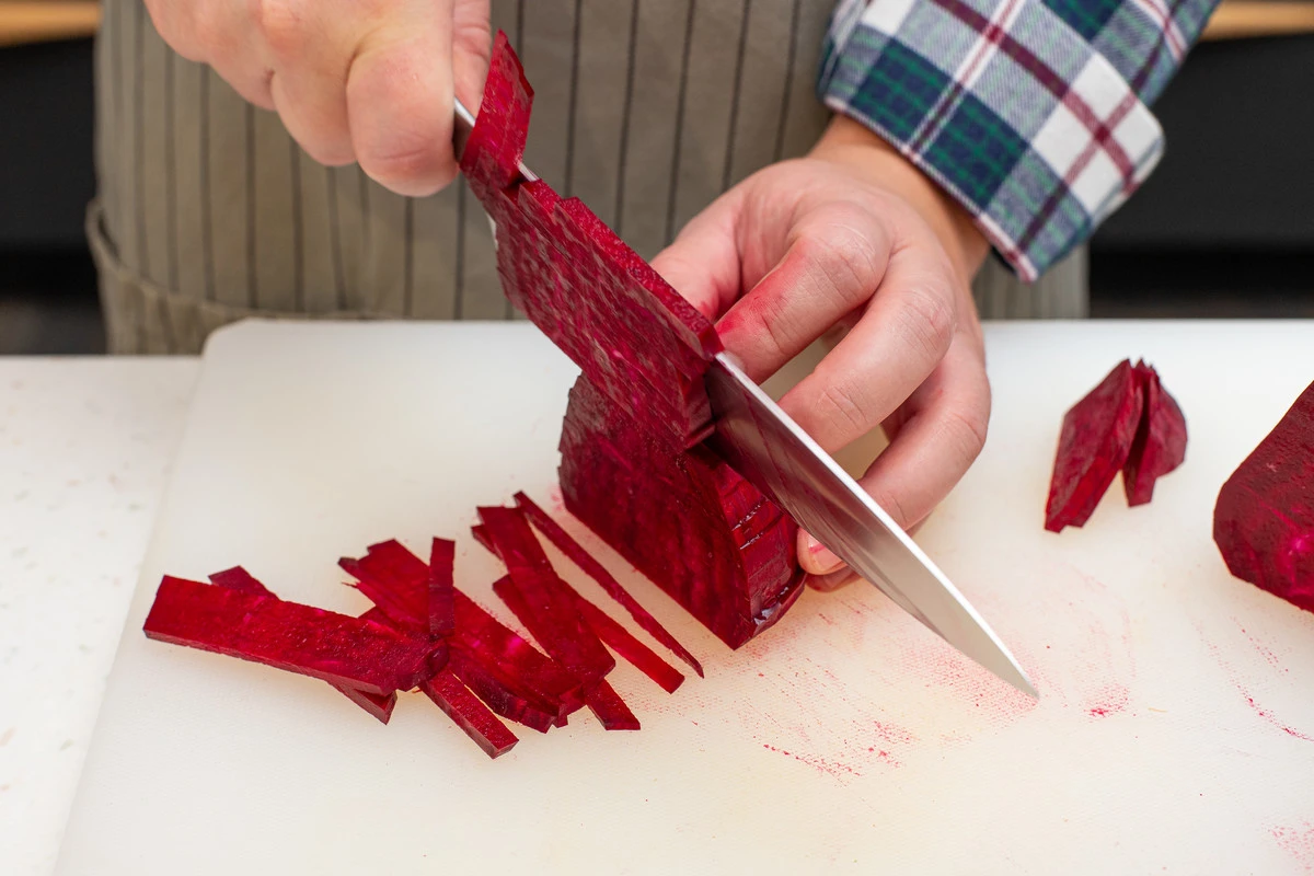 Свёклу почистите и нарежьте соломкой или также натрите на крупной тёрке.