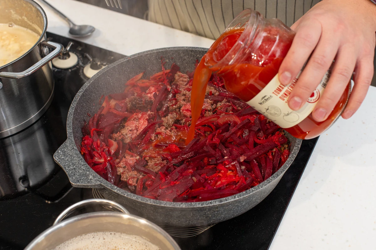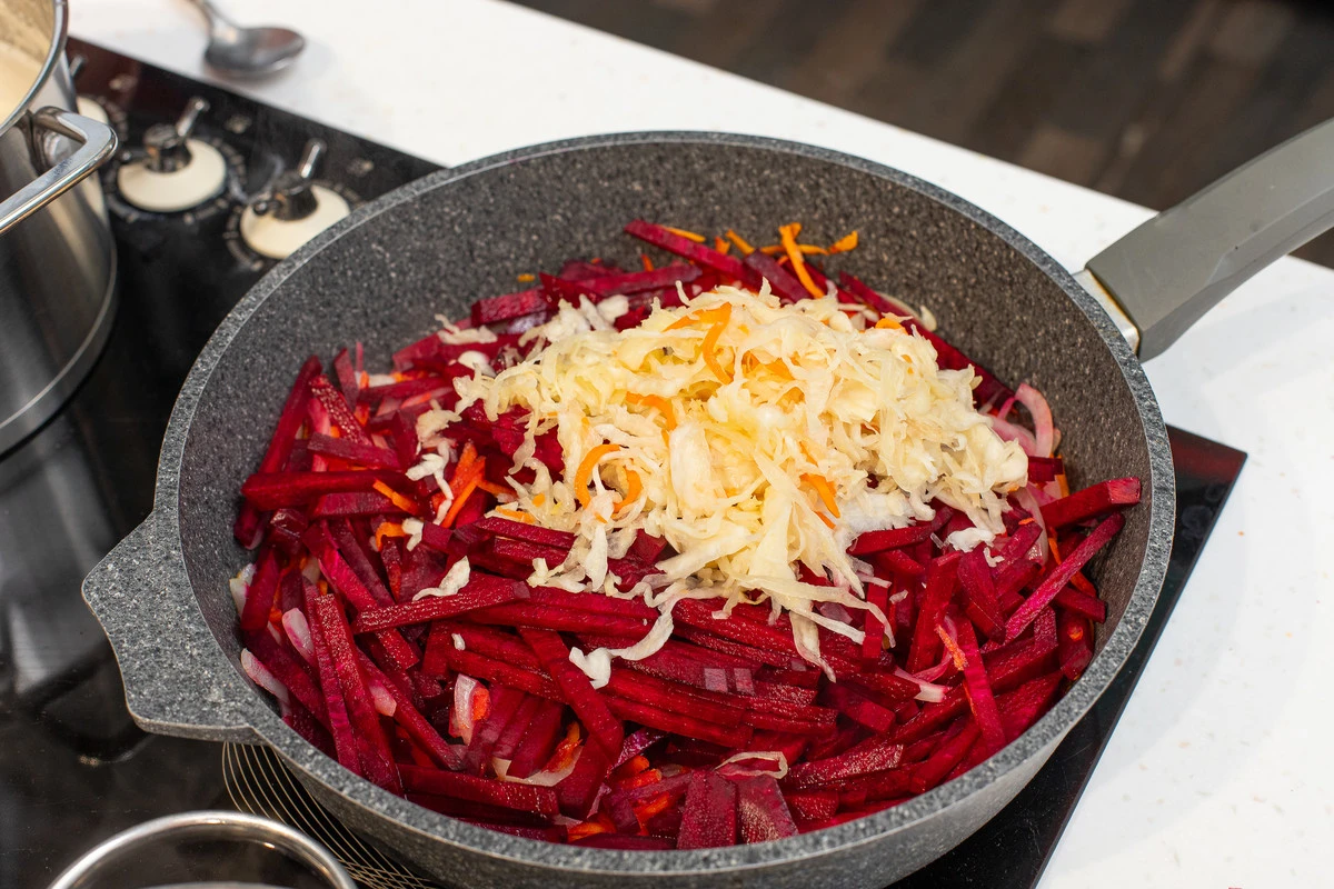 Выложите морковь и свёклу к луку и обжаривайте до готовности примерно 20-25 минут, периодически помешивая. Добавьте квашеную капусту и готовьте, периодически помешивая, ещё 30 минут.
