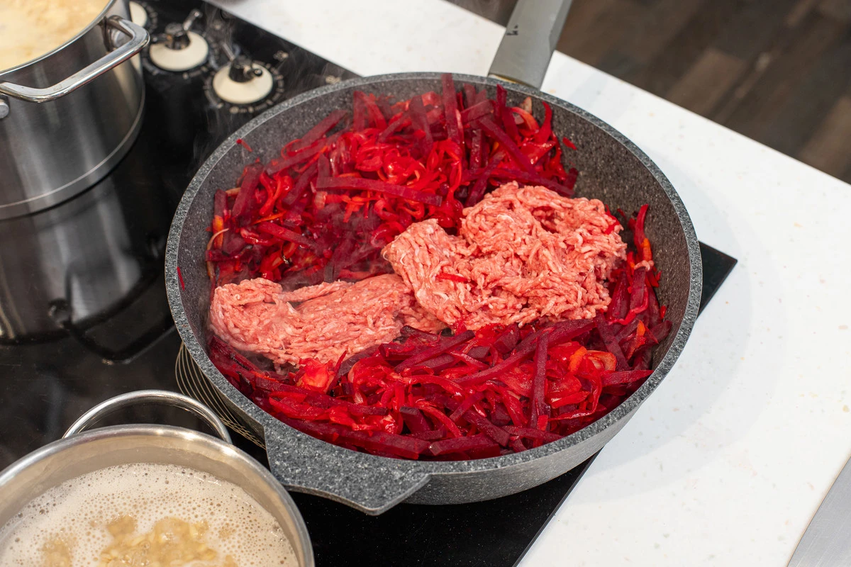 Немного раздвиньте овощи по краям и выложите на сковороду фарш. Обжарьте до золотистого цвета и смешайте с овощами.