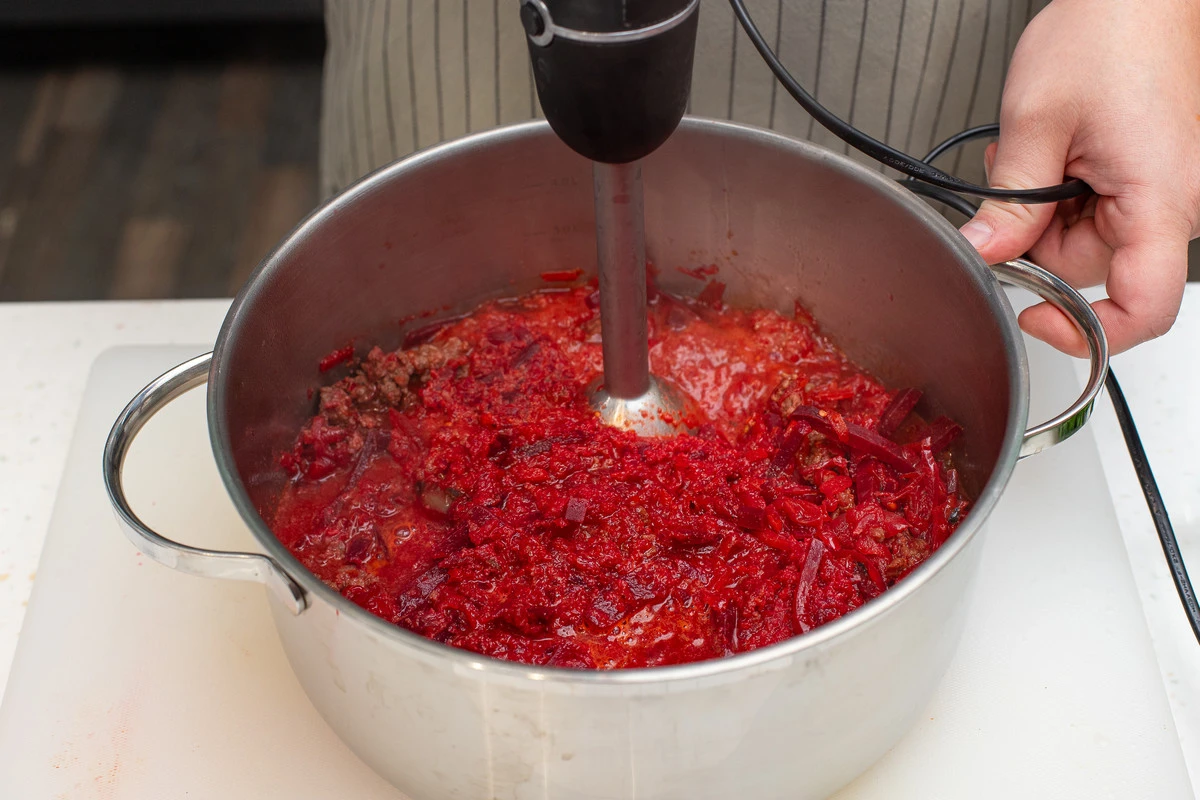 Измельчите овощи с фаршем блендером до однородности. Переложите обратно в сковороду.