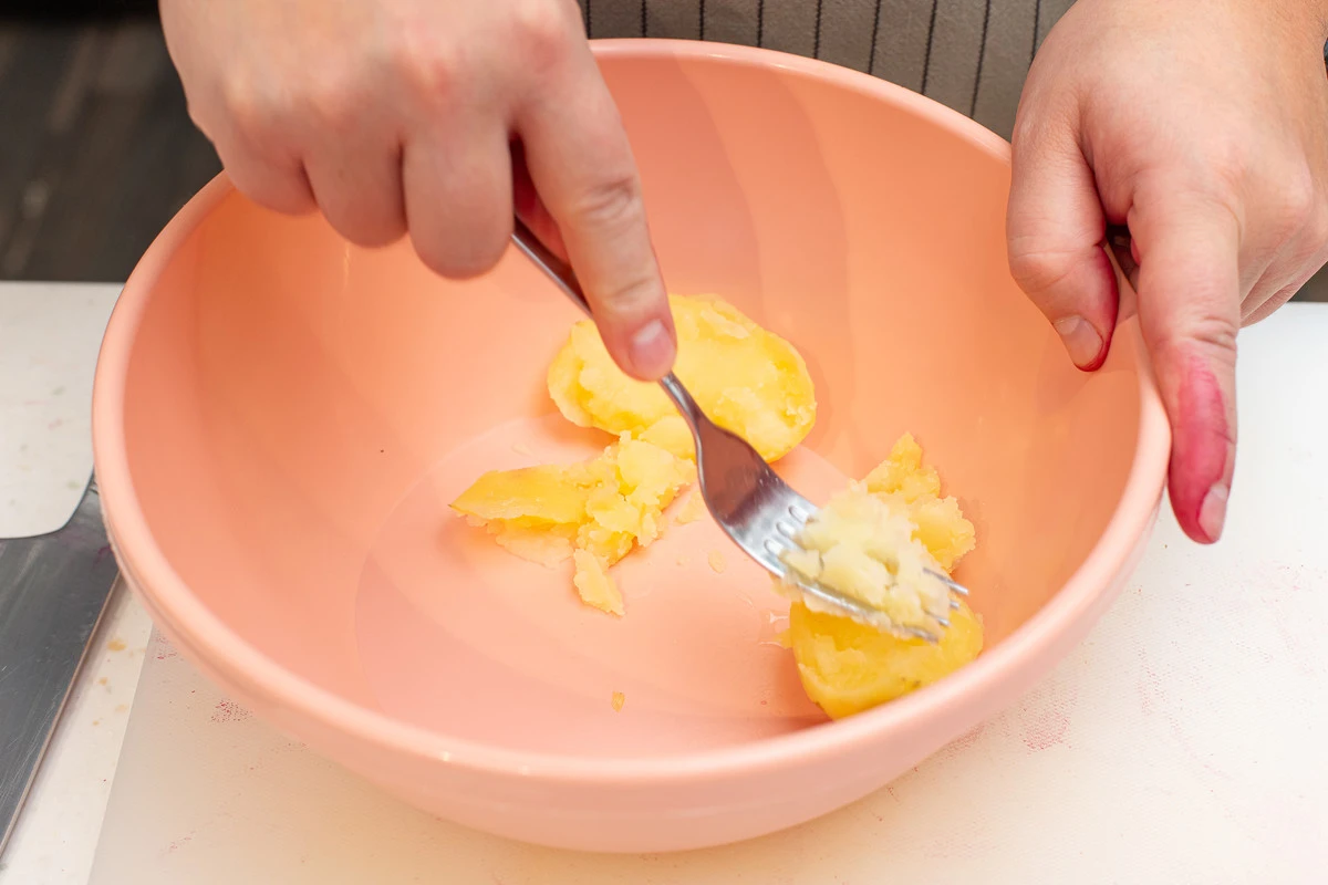Картофель помните вилкой, добавьте муку, яйца, посолите, поперчите и перемешайте до однородности.