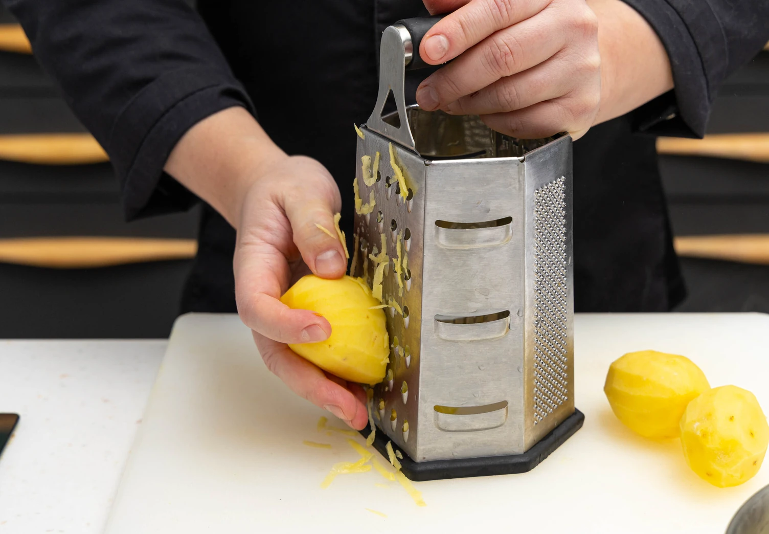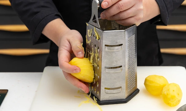 Оставшийся сырой картофель очистите и натрите на средней тёрке.