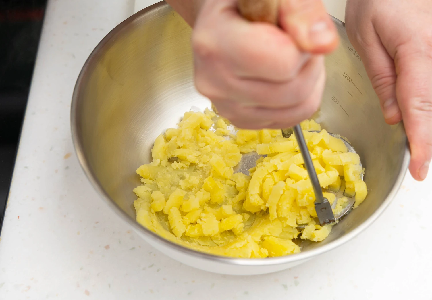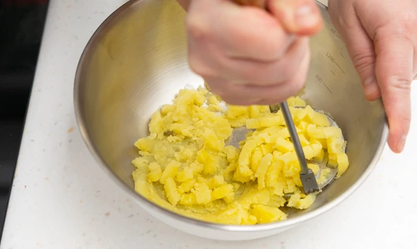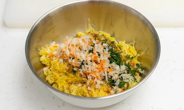 Готовый запечённый картофель немного остудите, очистите от кожуры и разомните вилкой в пюре. Добавьте его в миску к овощной массе и тщательно перемешайте, чтобы равномерно распределился по ней.