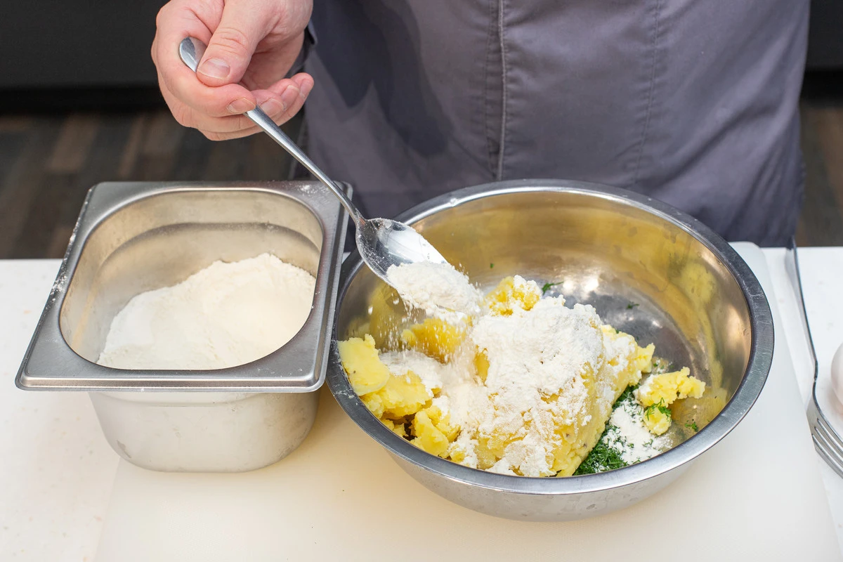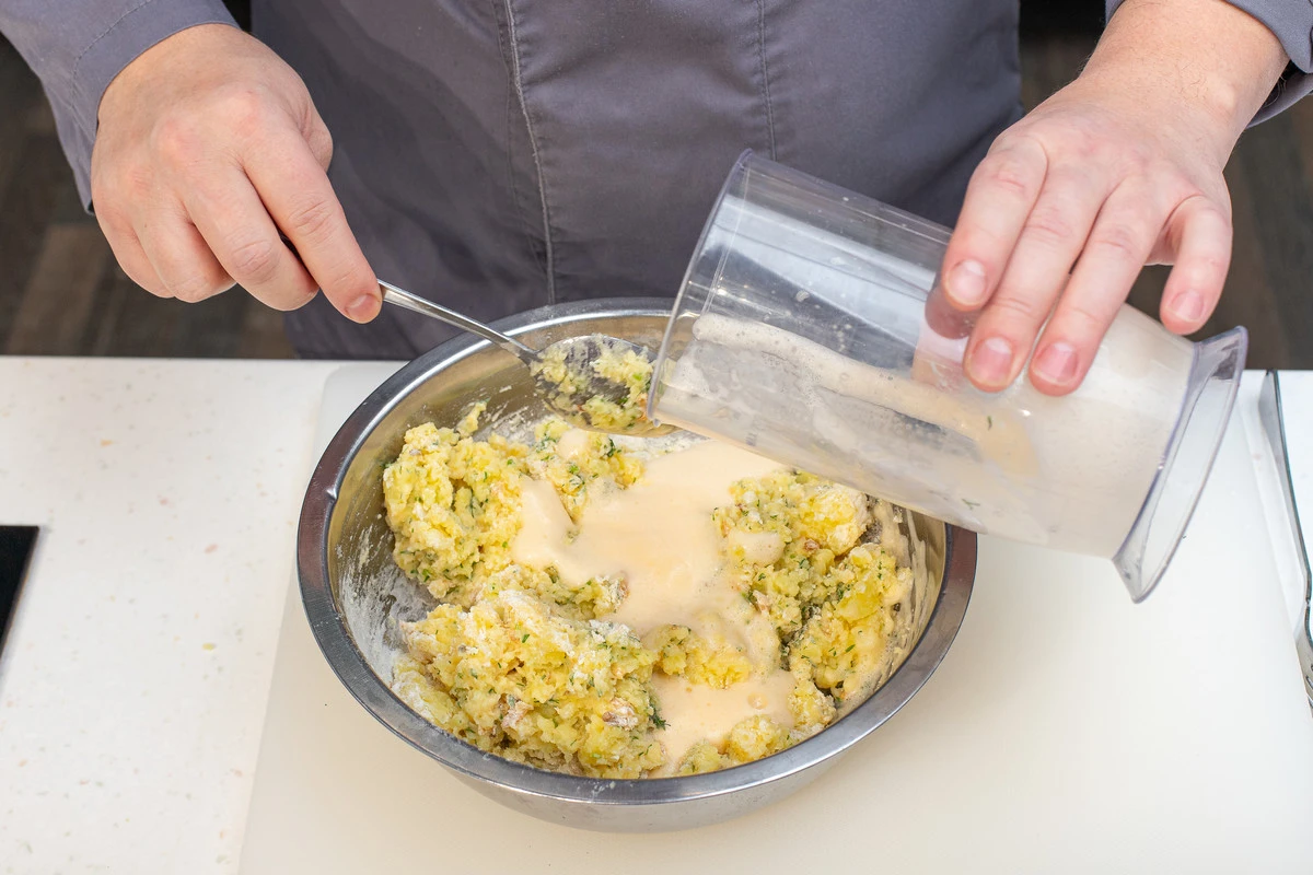 Добавьте к получившемуся пюре разрыхлитель, муку, соль, жареный лук и укроп.
