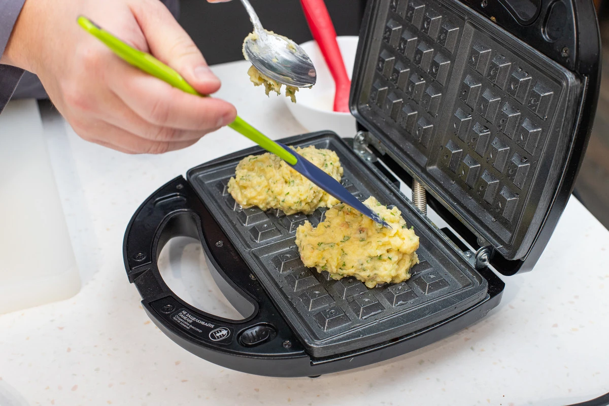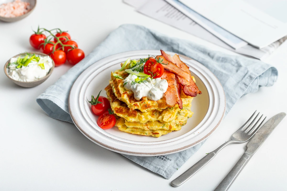 Картофельная вафля легко может стать и гарниром, и закуской, заменив привычные гренки или драники. Её можно дополнить любыми ингредиентами по вкусу — в этом рецепте мы предлагаем основательный вариант с беконом и сметанным соусом.