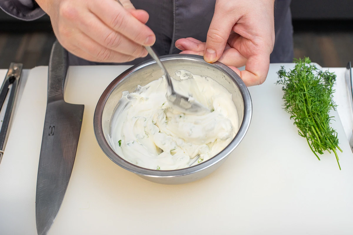Для соуса смешайте сметану, чили и мелко порубленные зелёный лук и укроп. По желанию можно добавить измельчённый зубчик чеснока.