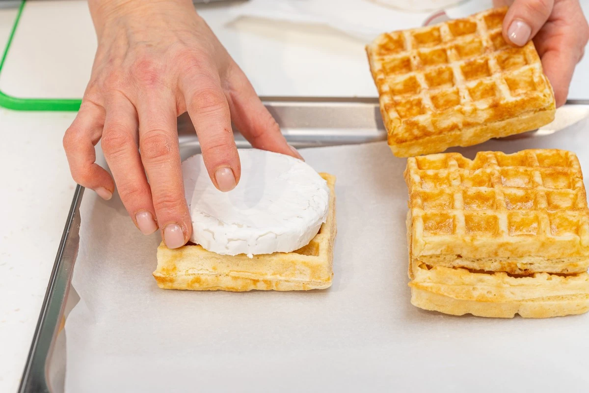 Камамбер разрежьте пополам поперёк. Положите на каждую вафлю по половинке камамбера и накройте оставшимися вафлями.