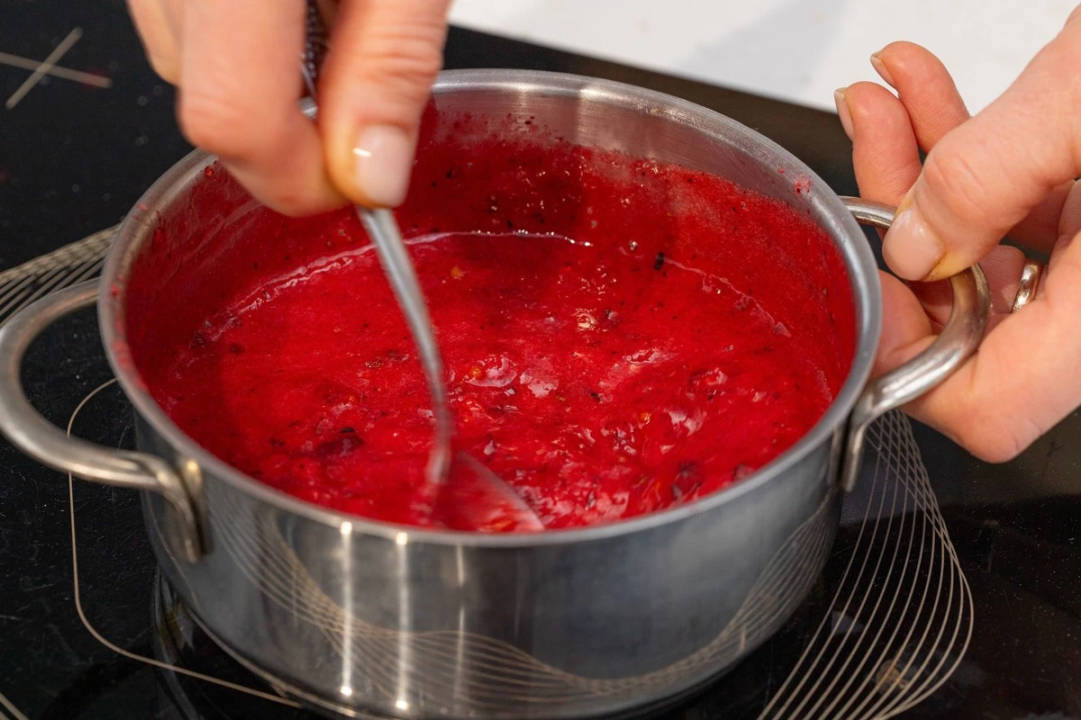 Пока запекаются вафли, сделайте соус. Переложите ягодную смесь в ковшик, доведите до кипения, всё время помешивая, и снимите с плиты.