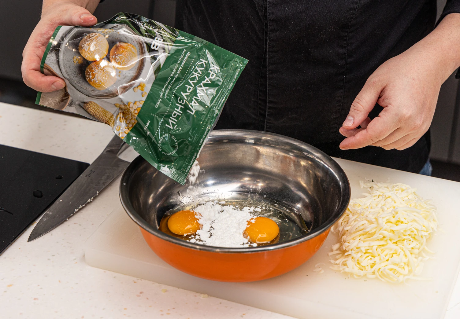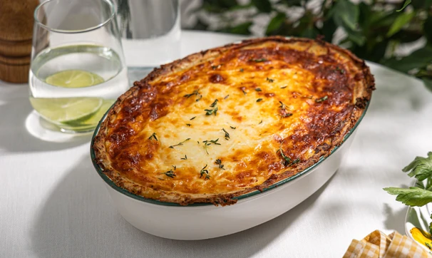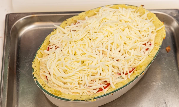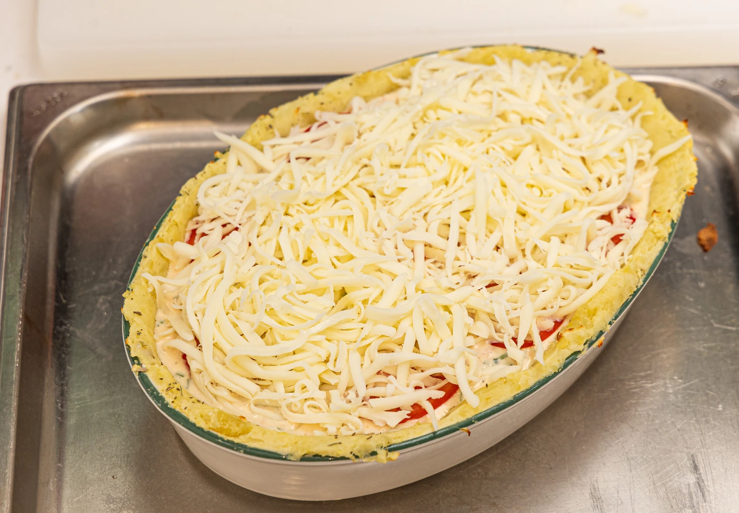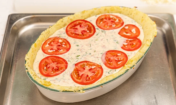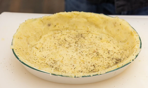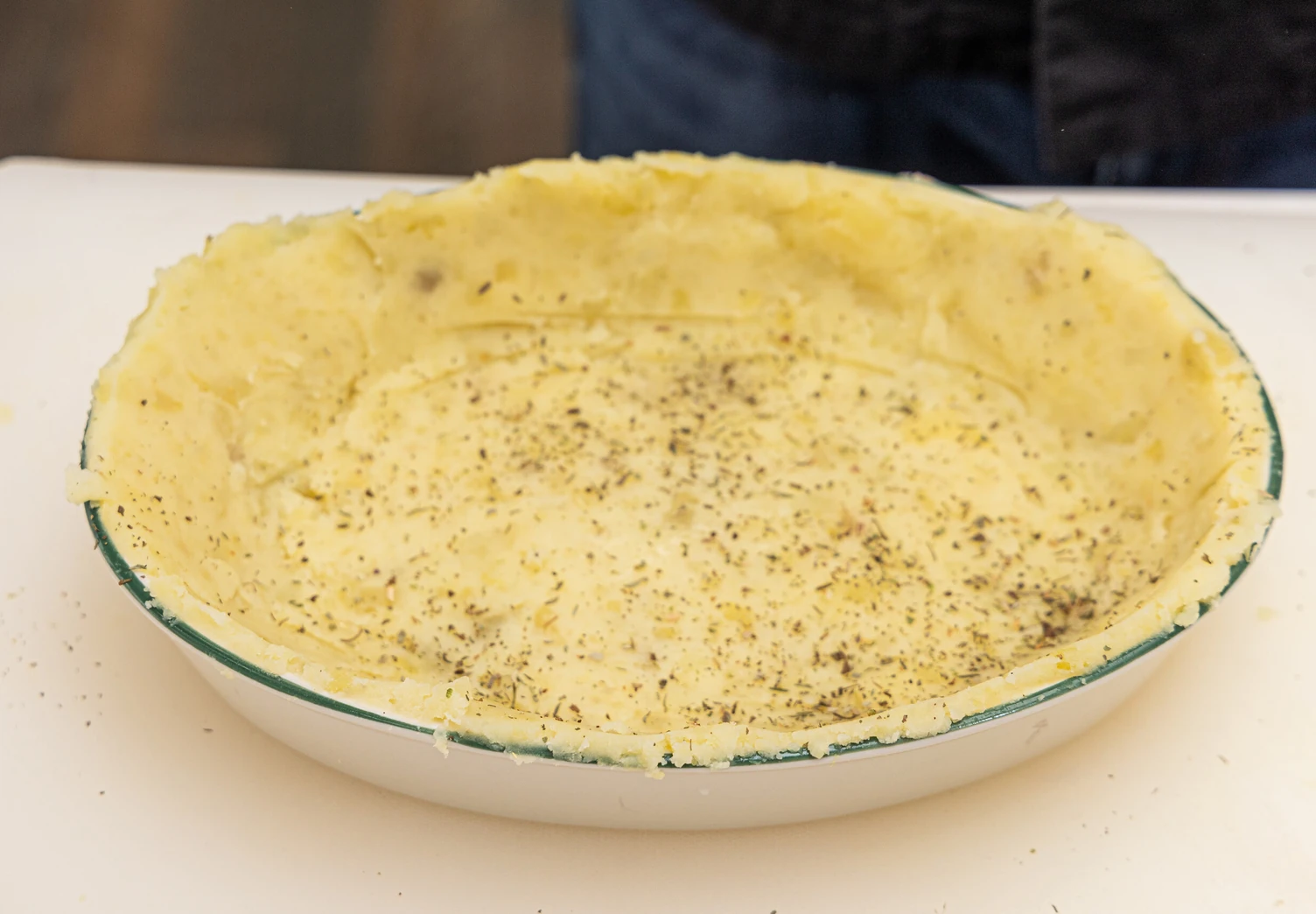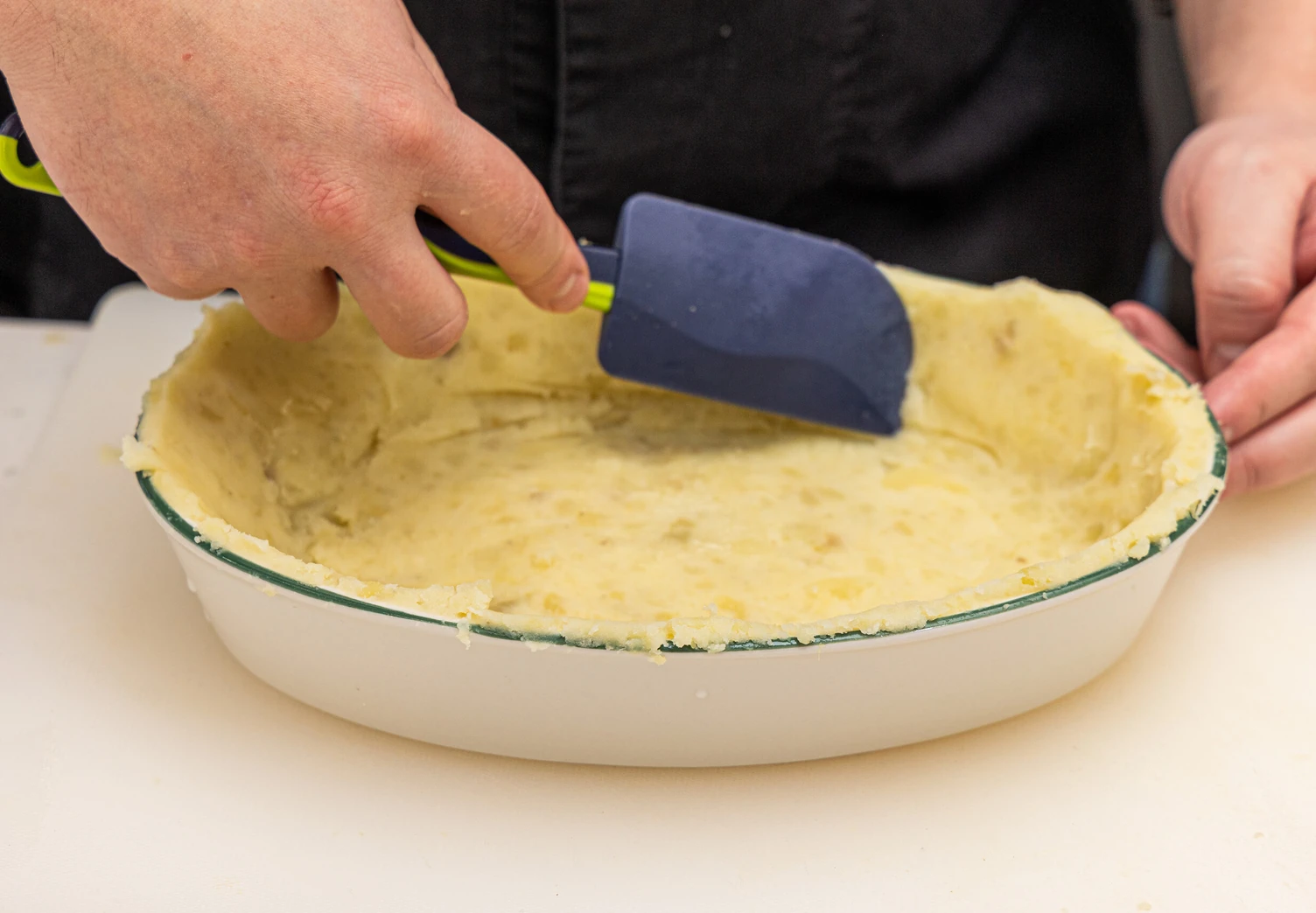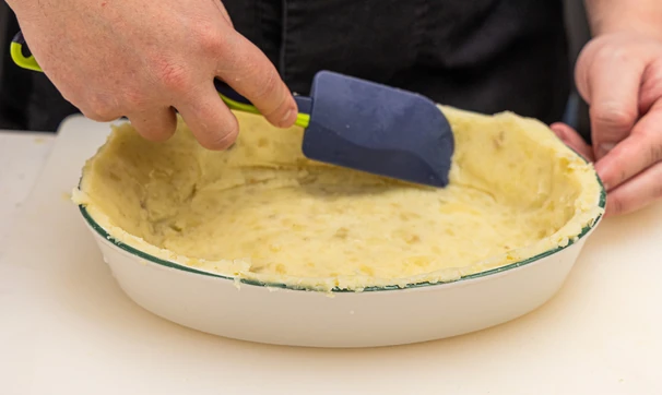 Смажьте форму для запекания маслом, выложите в неё отварной картофель и разомните его толкушкой, формируя дно и бортики.