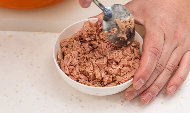 Тем временем слейте с тунца жидкость и разомните его вилкой.