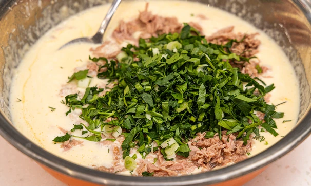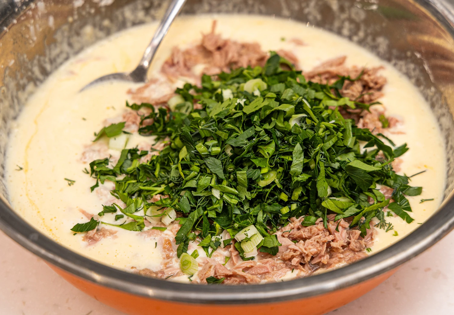 Добавьте к яйцам йогурт, мелко нарезанную зелень и тунец, затем хорошо перемешайте.