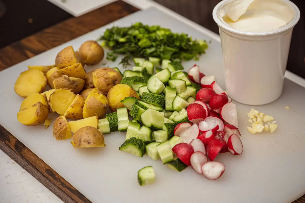 Картофель и редиску нарежьте четвертинками, огурцы — толстыми полукольцами.