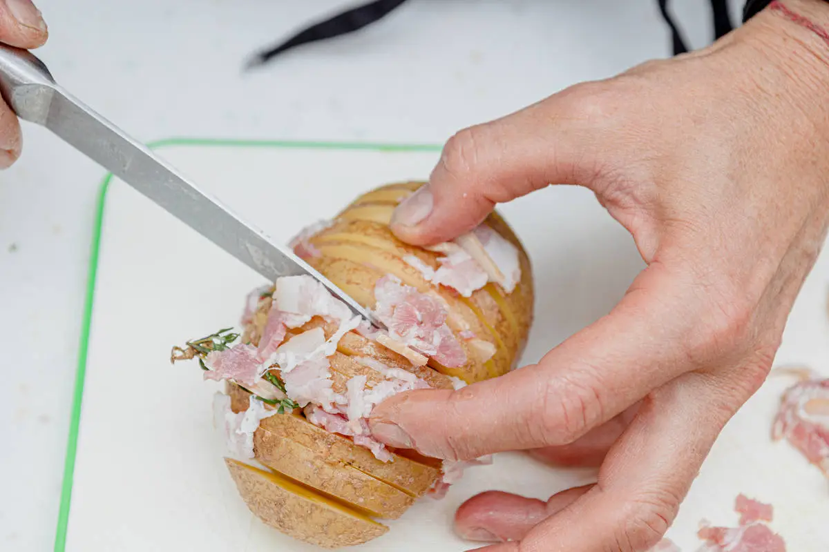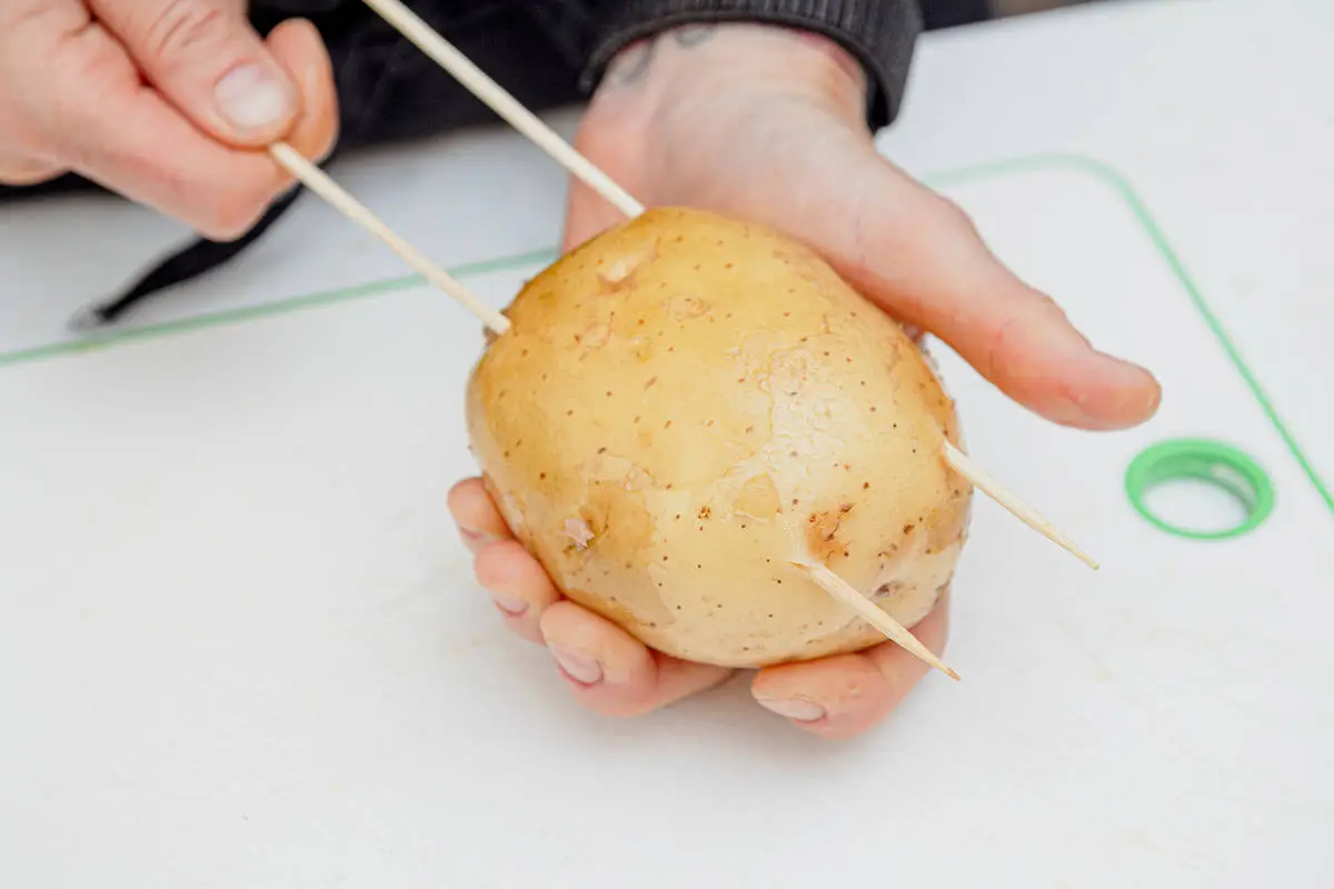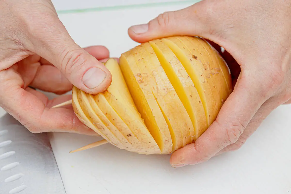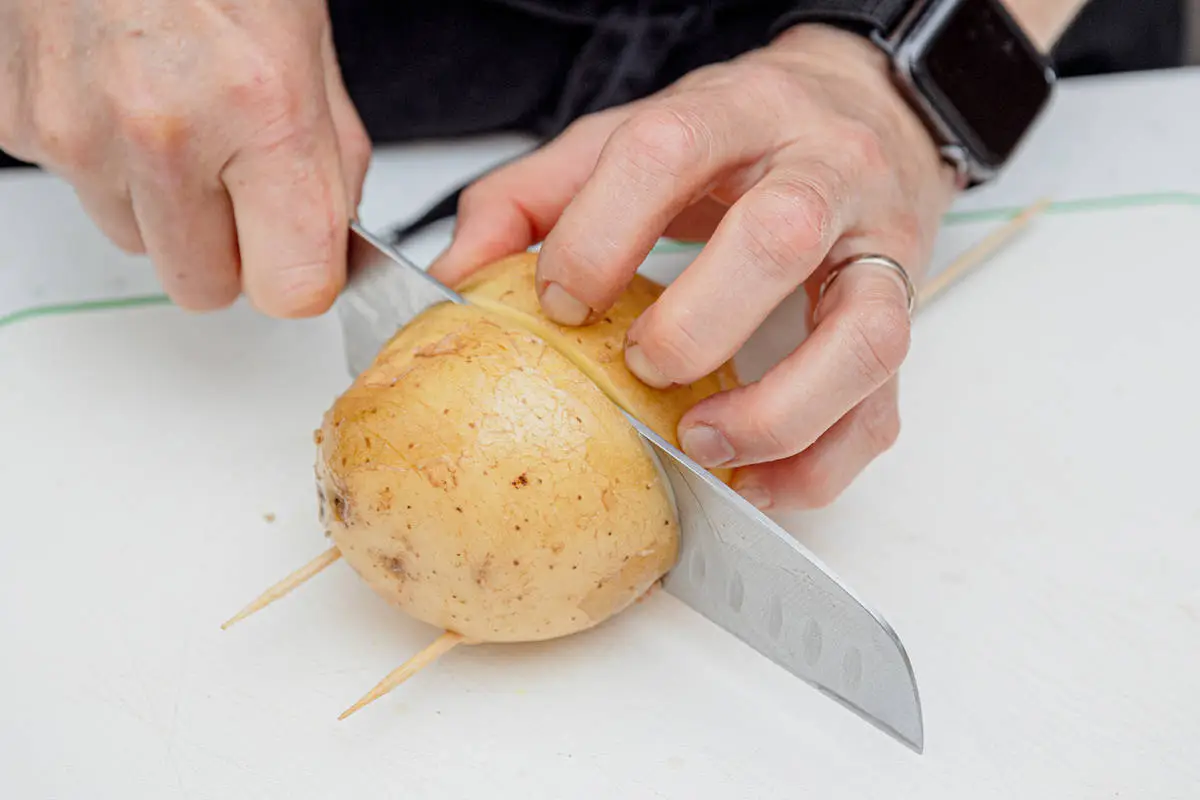Аккуратно проткните шпажками картофелину насквозь вдоль, максимально близко к кожуре. Так у вас получится «ограничитель»: нарезая гармошку, вы не прорежете картошку насквозь.