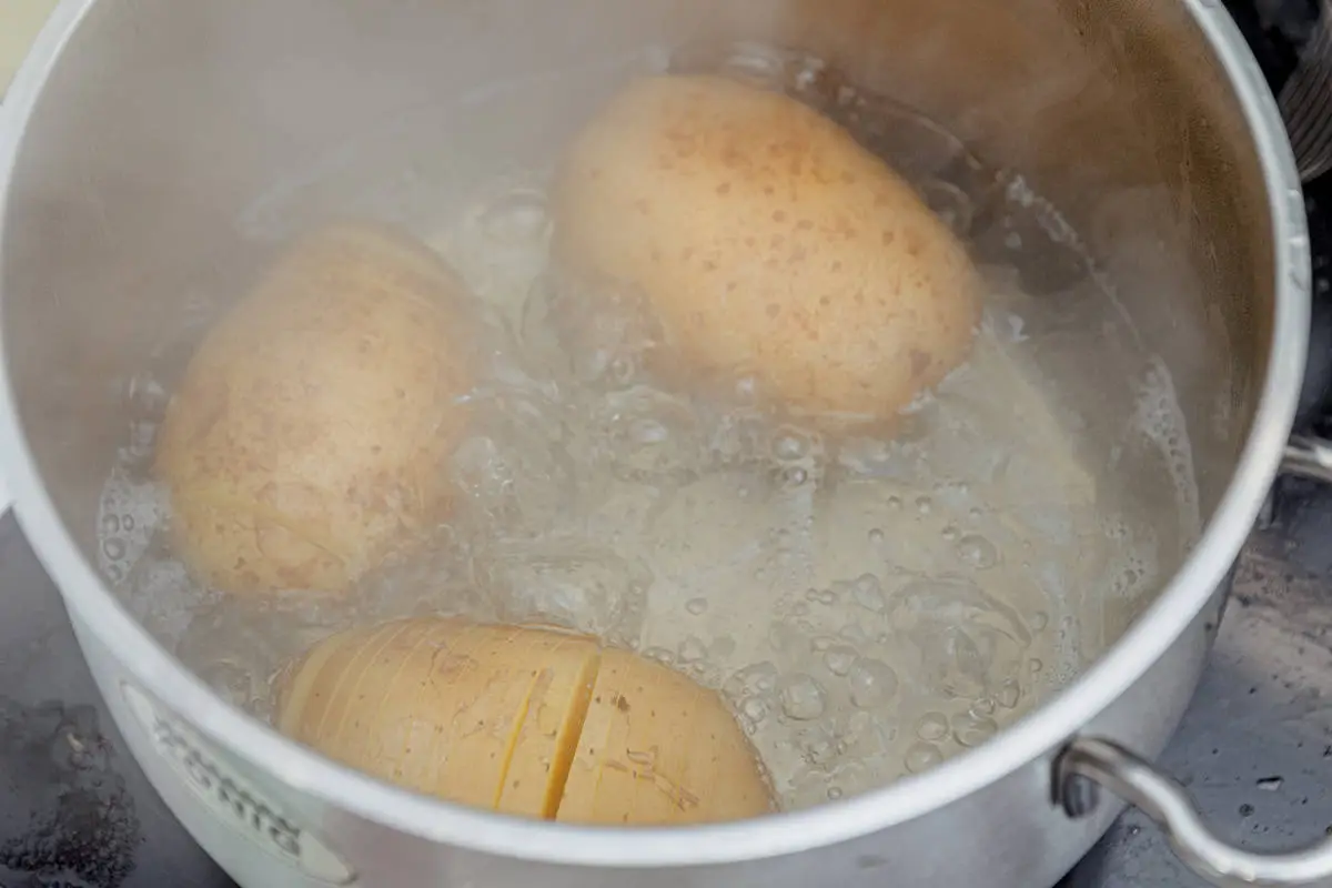 Вскипятите воду в кастрюле, отварите надрезанные картофелины в течение 10 минут.
