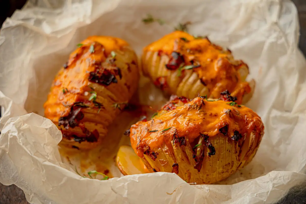 Очень эффектный и праздничный вариант картофеля в духовке. Чтобы гармошка получилась аккуратной, выбирайте крупные и ровные картофелины. И обязательно используйте лайфхак со шпажками.
