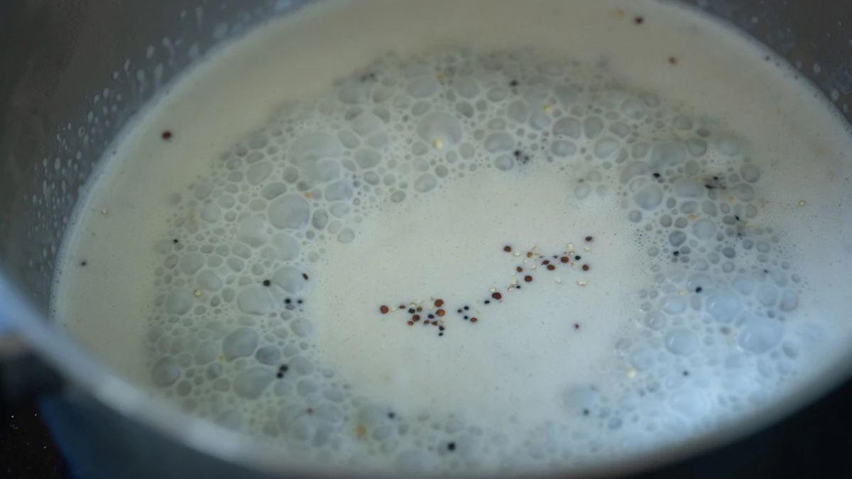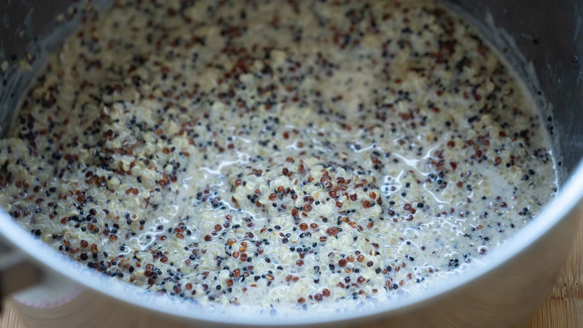 Смесь киноа залейте водой и кокосовым молоком и варите на самом медленном огне примерно 40 минут.