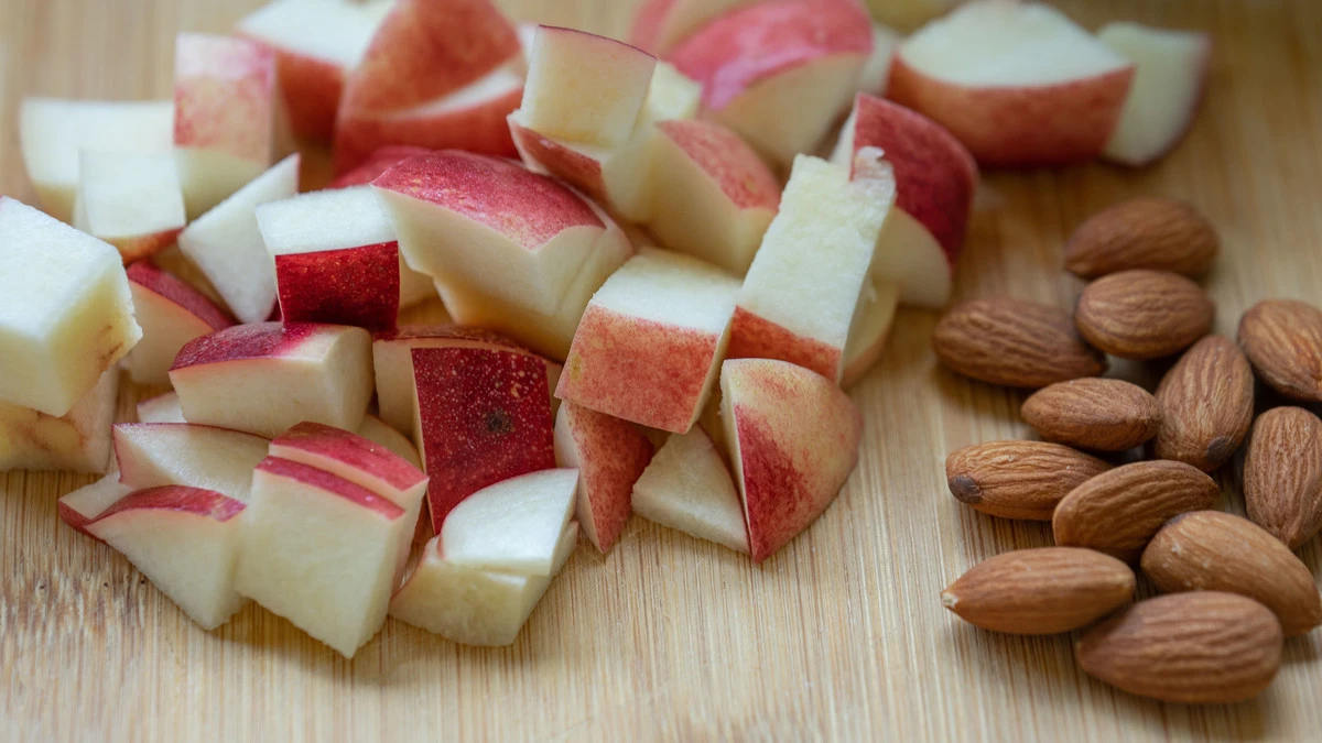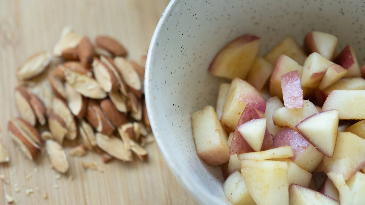 Пока варится киноа, нарежьте нектарин кубиками, несколько тонких долек оставьте для украшения.