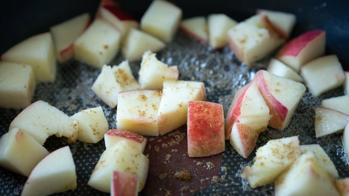 Разогрейте сотейник, добавьте нектарин, пару ложек воды, сахар и молотую корицу. Быстро смешайте на высоком огне до растворения сахара и уберите с плиты.