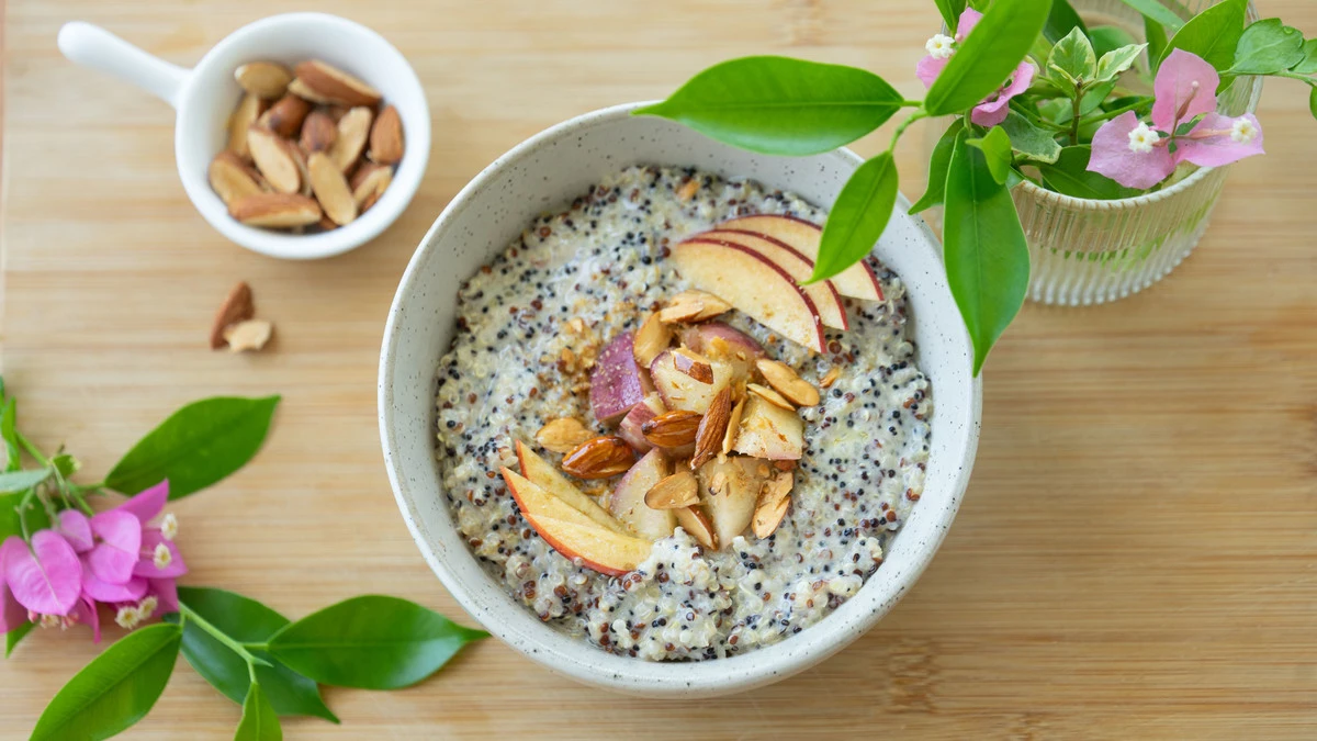 Каша из киноа на кокосовом молоке с нектарином и миндалём