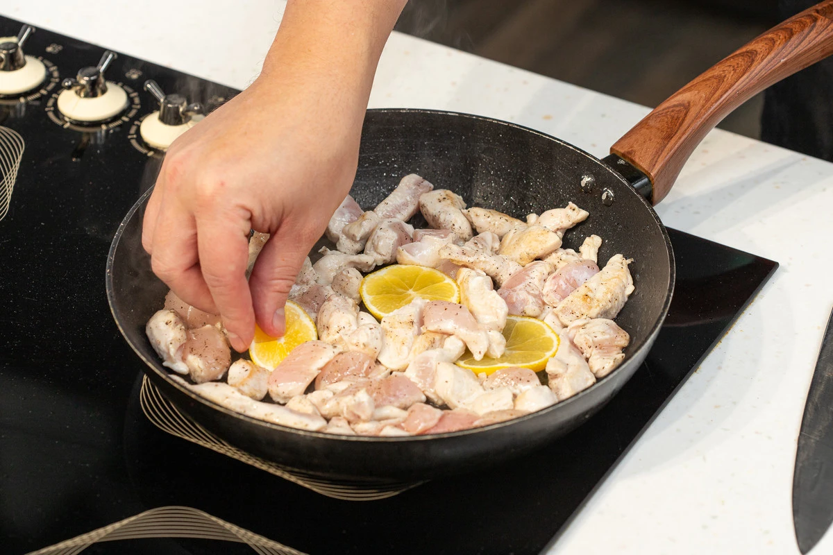 Посолите, поперчите, добавьте 100 мл воды, нарезанный слайсами лимон и томите ещё 5 минут. Так курица получится сочной и мягкой. Снимите с огня, остудите.