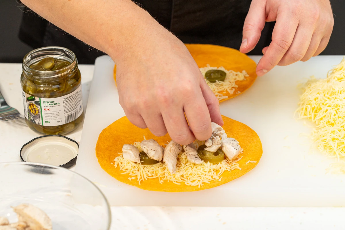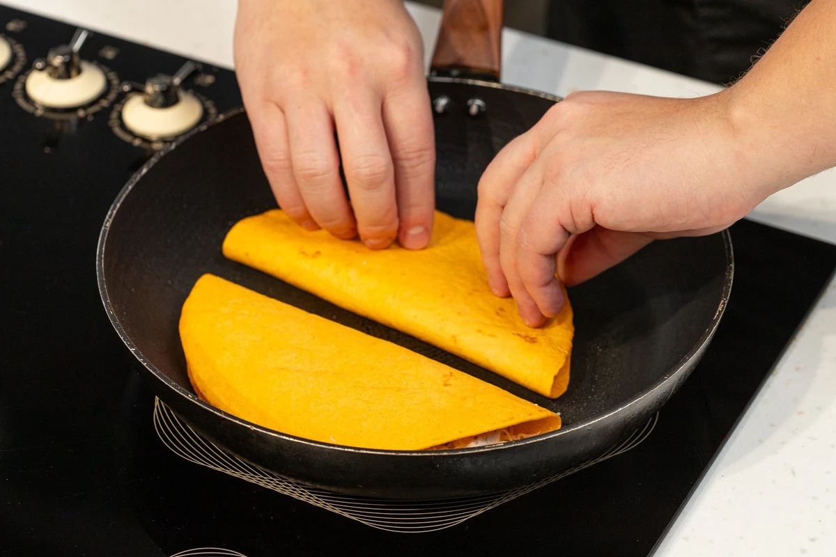 Закройте тортилью и выложите её на сухую раскалённую сковороду. Запекайте по 1 минуте с каждой стороны.