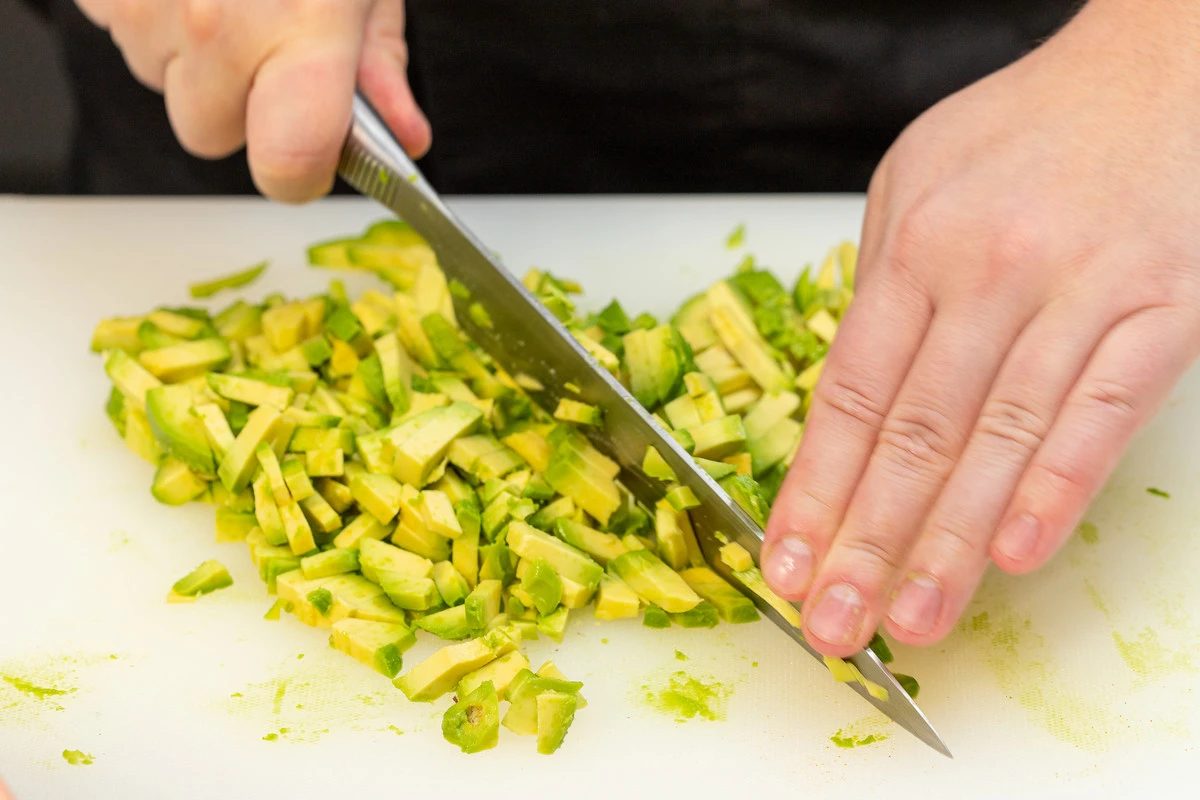 Для соуса гуакамоле почистите авокадо и удалите косточку. Порубите мякоть мелким кубиком.
