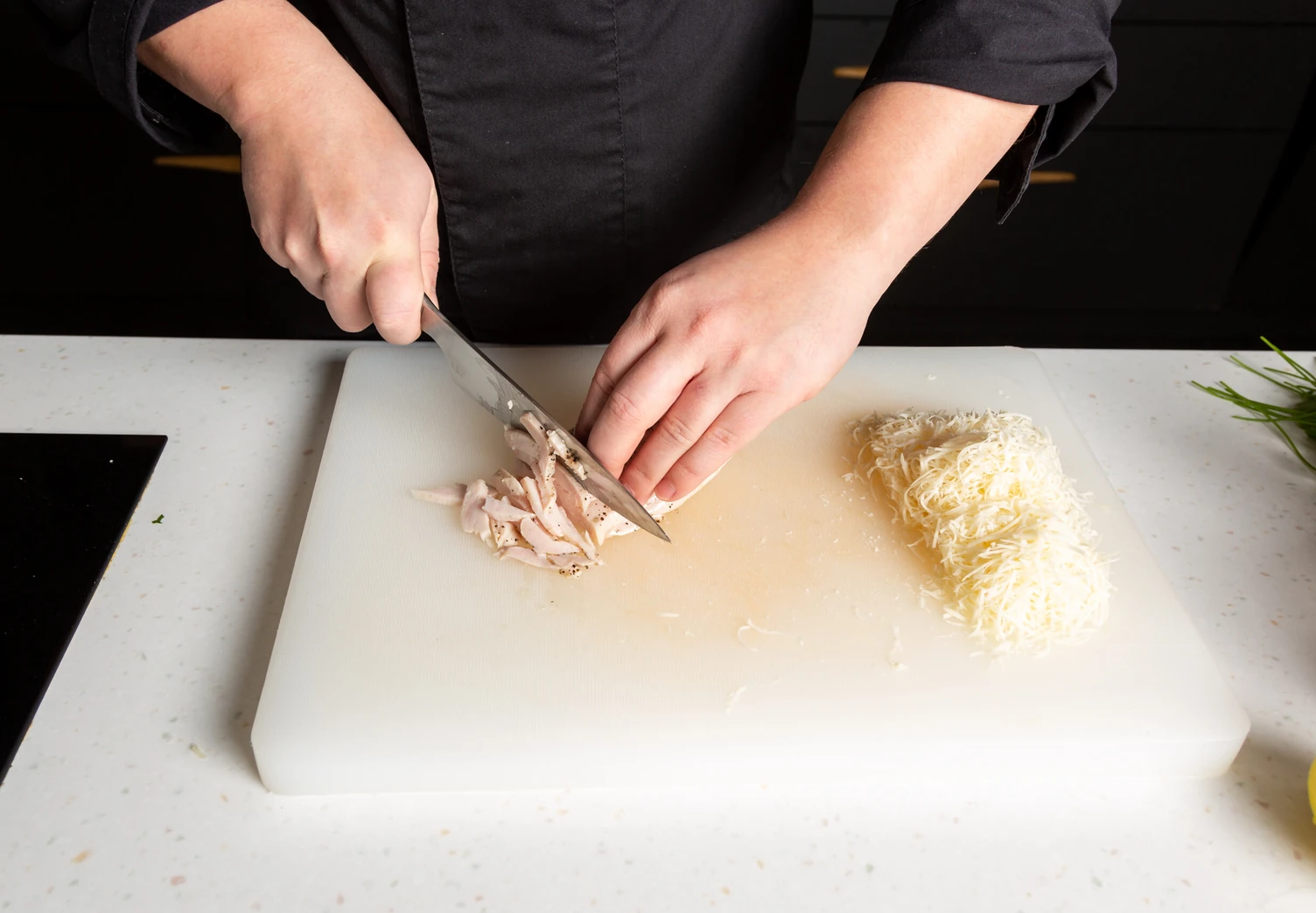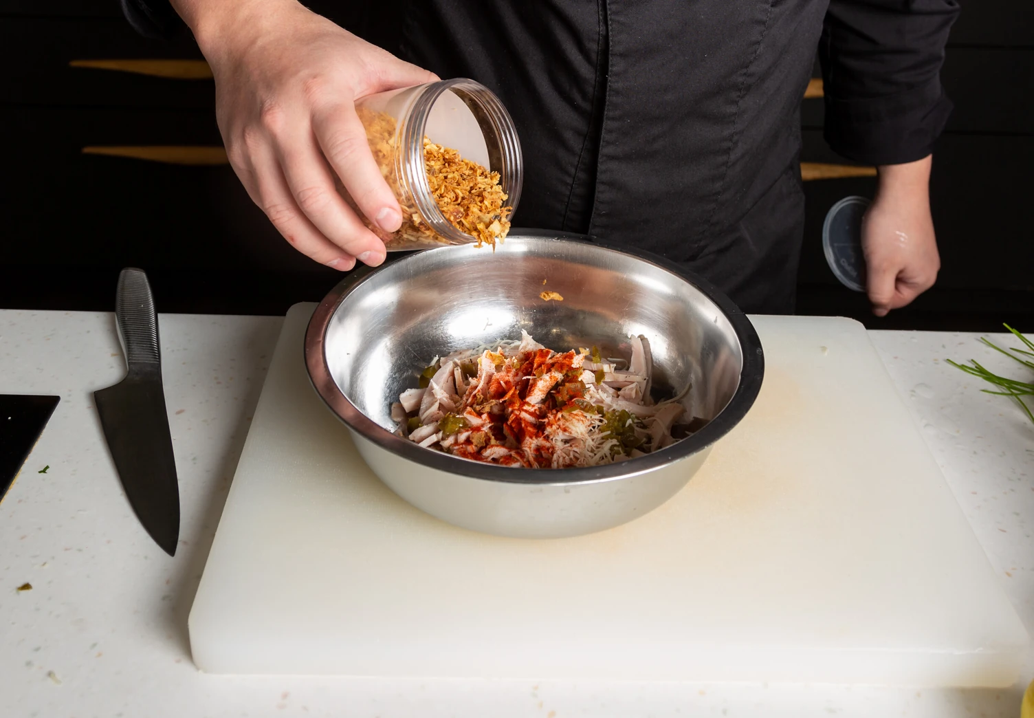 Смешайте курицу с тёртым сыром, рубленым халапеньо и луком фри, добавьте специи по вкусу.