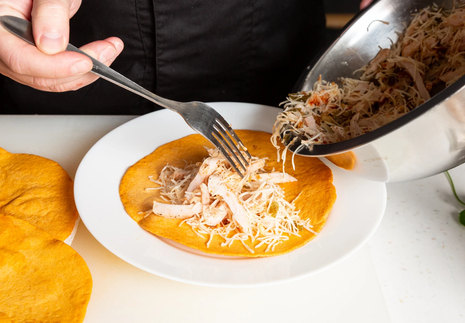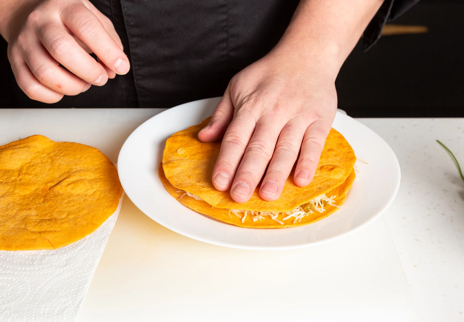 Равномерно распределите начинку по тортильям, затем накройте каждую из них второй лепёшкой и слегка придавите рукой или плоским дном кастрюли.
