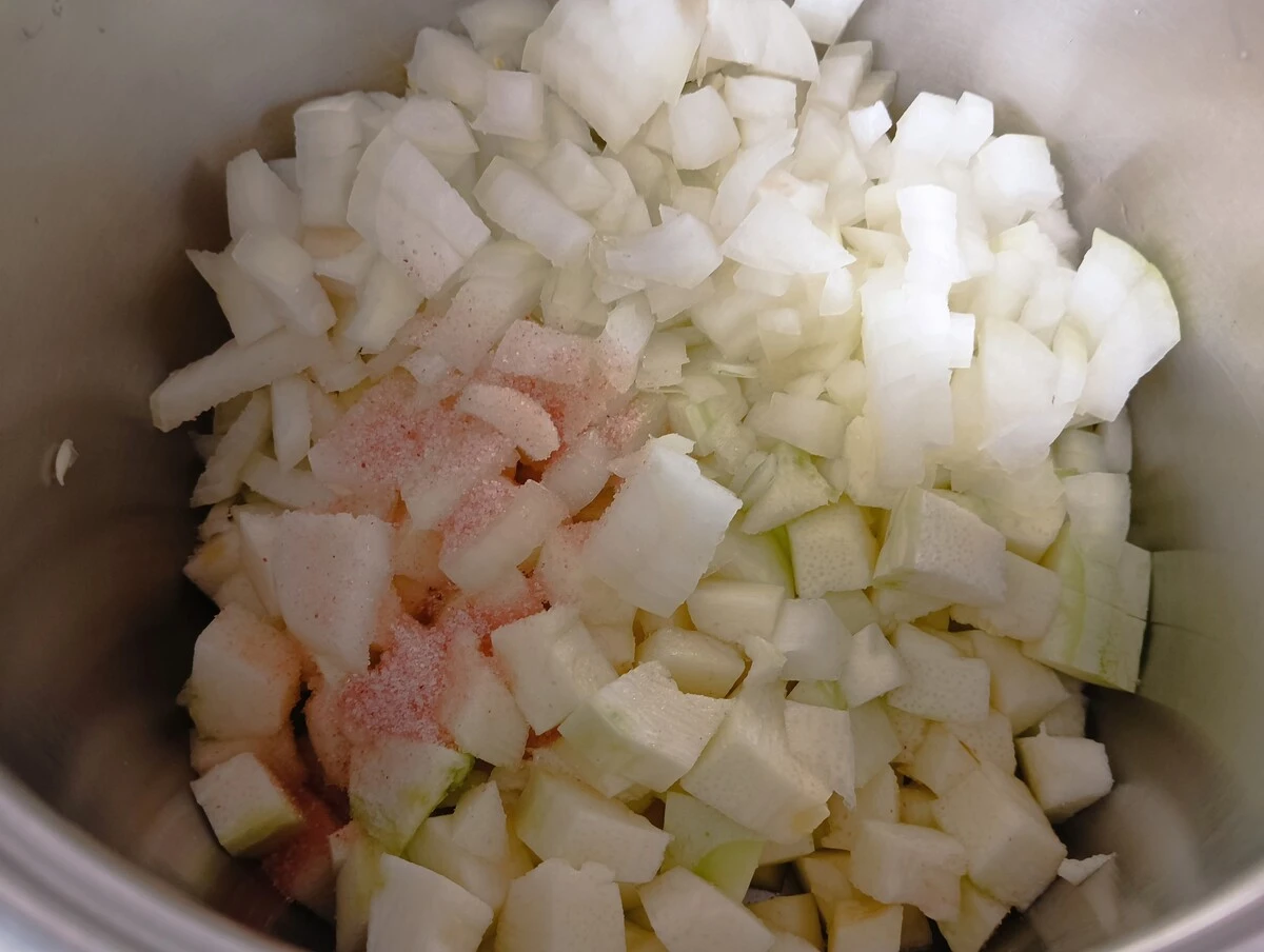 В кастрюлю с толстым дном выложите кабачки, лук и соль, доведите до кипения, варите 20 минут.
