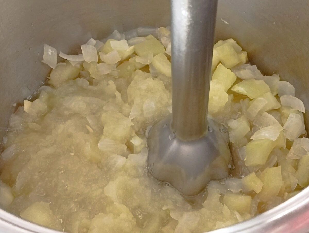 Снимите кастрюлю с огня, измельчите кабачки с луком блендером.