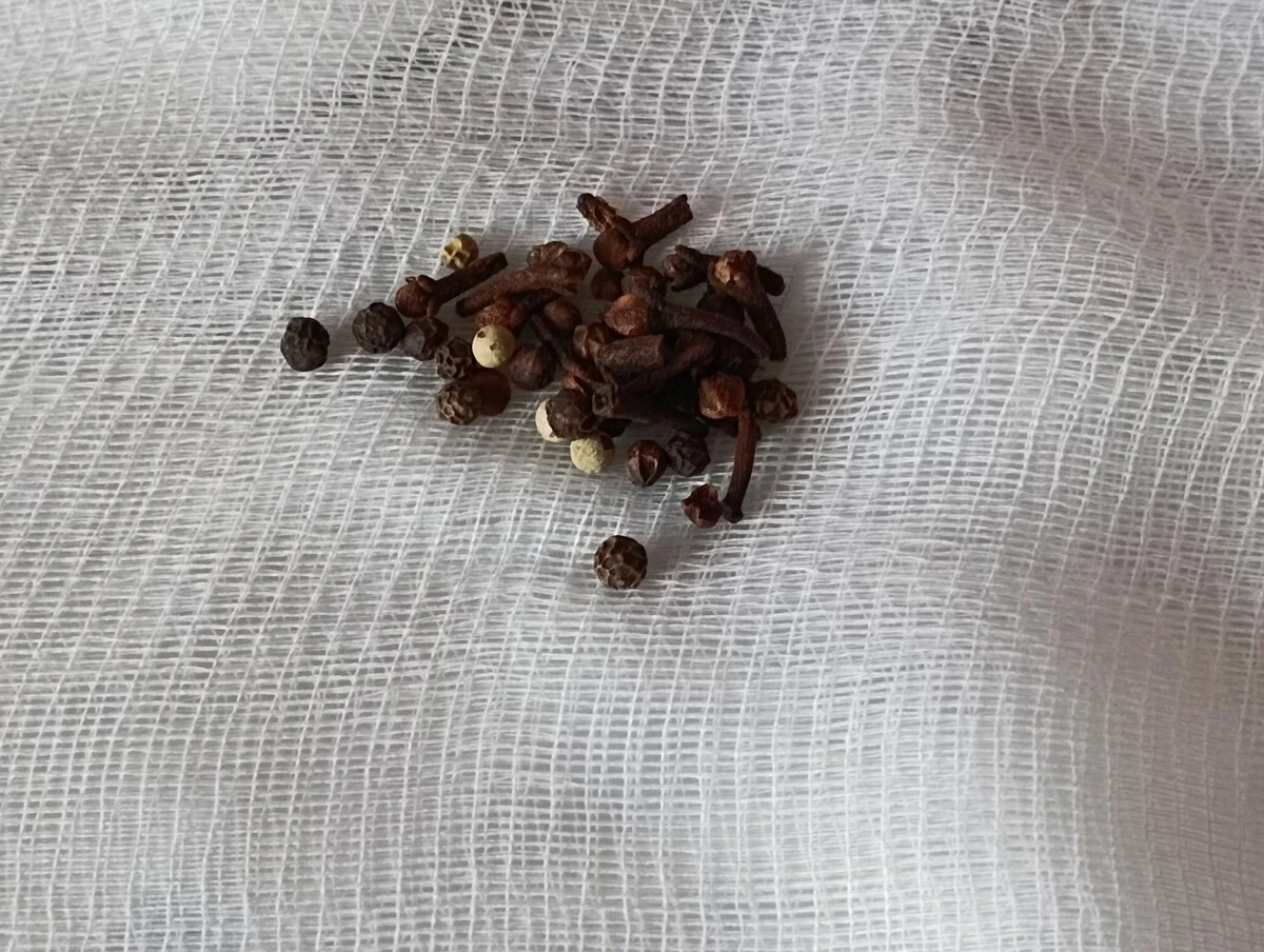 Соберите специи в кусочек марли и завяжите в мешочек.