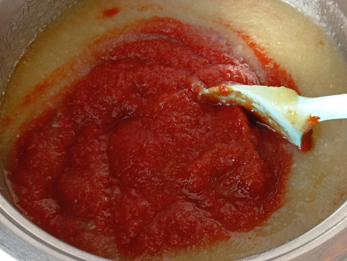 Добавьте в измельчённые кабачки сахар, томатную пасту и мешочек специй. Варите на медленном огне 25 минут, постоянно помешивая.