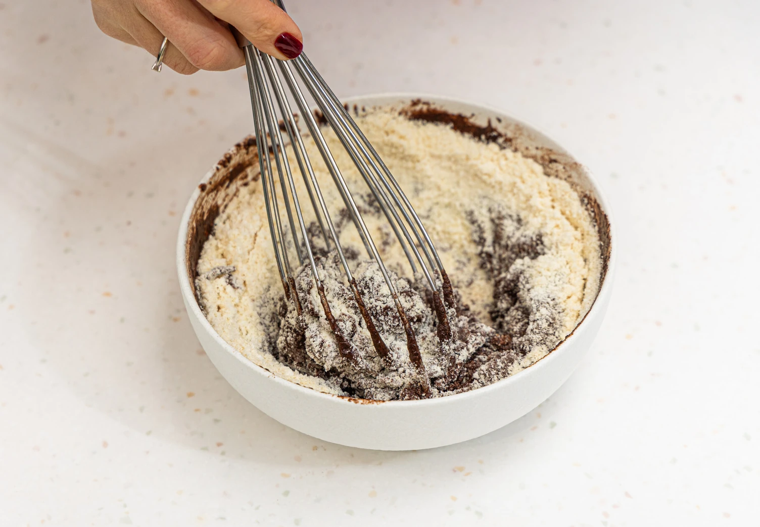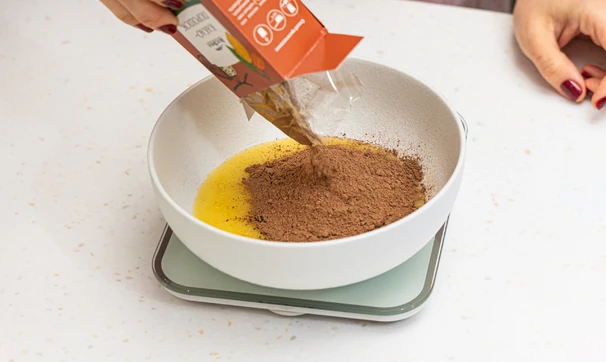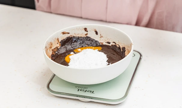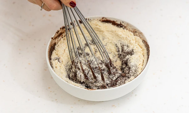 Добавьте миндальную муку и разрыхлитель. Перемешайте ингредиенты.