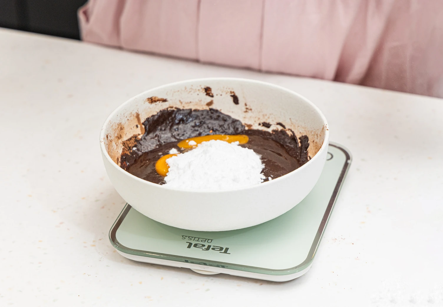 Вбейте в шоколадно-масляную смесь яйца и всыпьте эритритол.