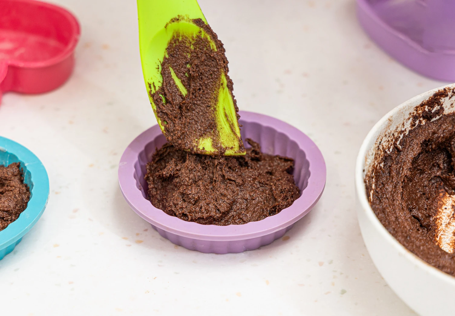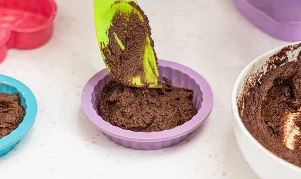 Переложите массу в силиконовую форму (можно использовать одну большую или несколько маленьких) и выпекайте 20–25 минут в духовке, разогретой до 180 °C.