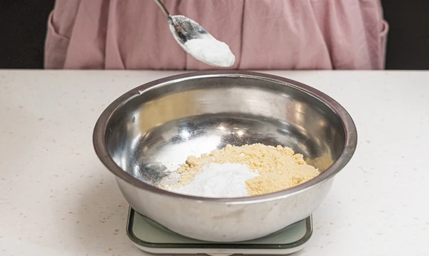 Смешайте миндальную муку, растопленное сливочное масло и эритритол до состояния влажной крошки.